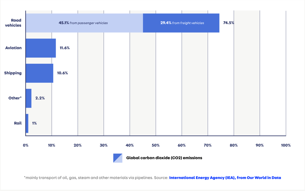 It’s no secret that transport hasn’t been great for the planet. In fact, transport accounts for around one-fifth of global carbon dioxide (CO2) emissions, broken down as follows: