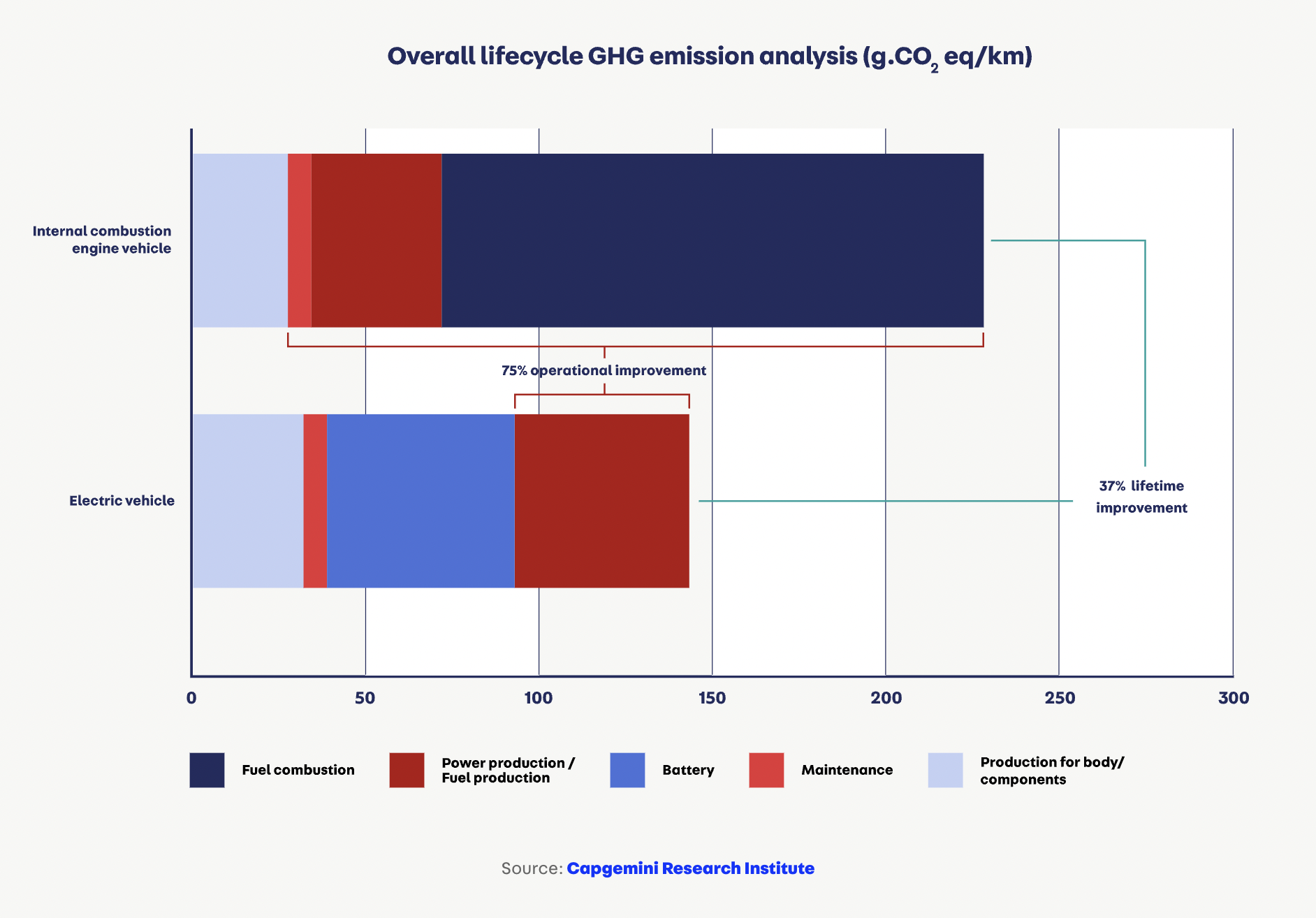 According to the Capgemini Research Institute report, the shift to electric vehicles would cut the overall lifetime Greenhouse Gas (GHG) footprint by about 37% for passenger vehicles, while reducing the operating footprint by 75%.