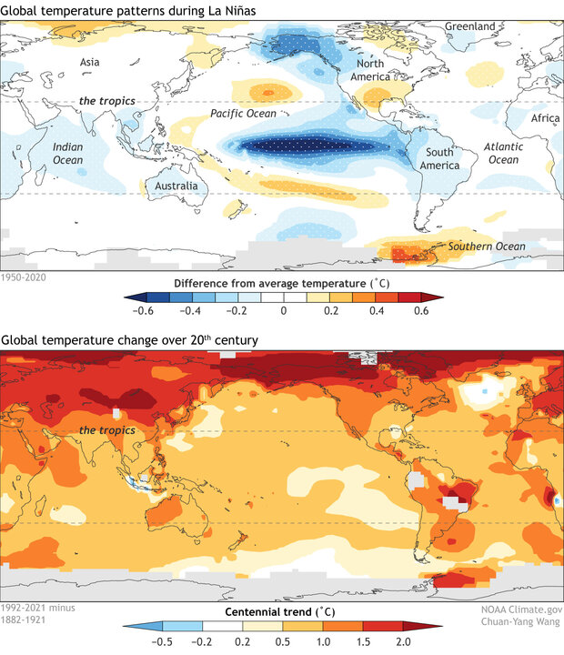 Shang-Ping:Ā During La NiƱa, the surface cooling of the equatorial Pacific is due to the intensified trade winds thatĀ upwell cold waterĀ from beneath. This causes major shifts in atmospheric convection (heavy tropical showers and thunderstorms) and circulation. These changes in tropical convection also induce large atmospheric waves with horizontal scales of thousands of miles that communicate the La NiƱa effect to the rest of the tropics. As a result, La NiƱa causes the rest of the tropics to coolāboth over the oceans and on land.