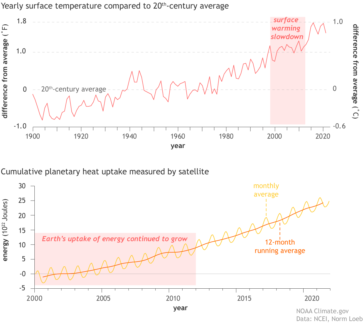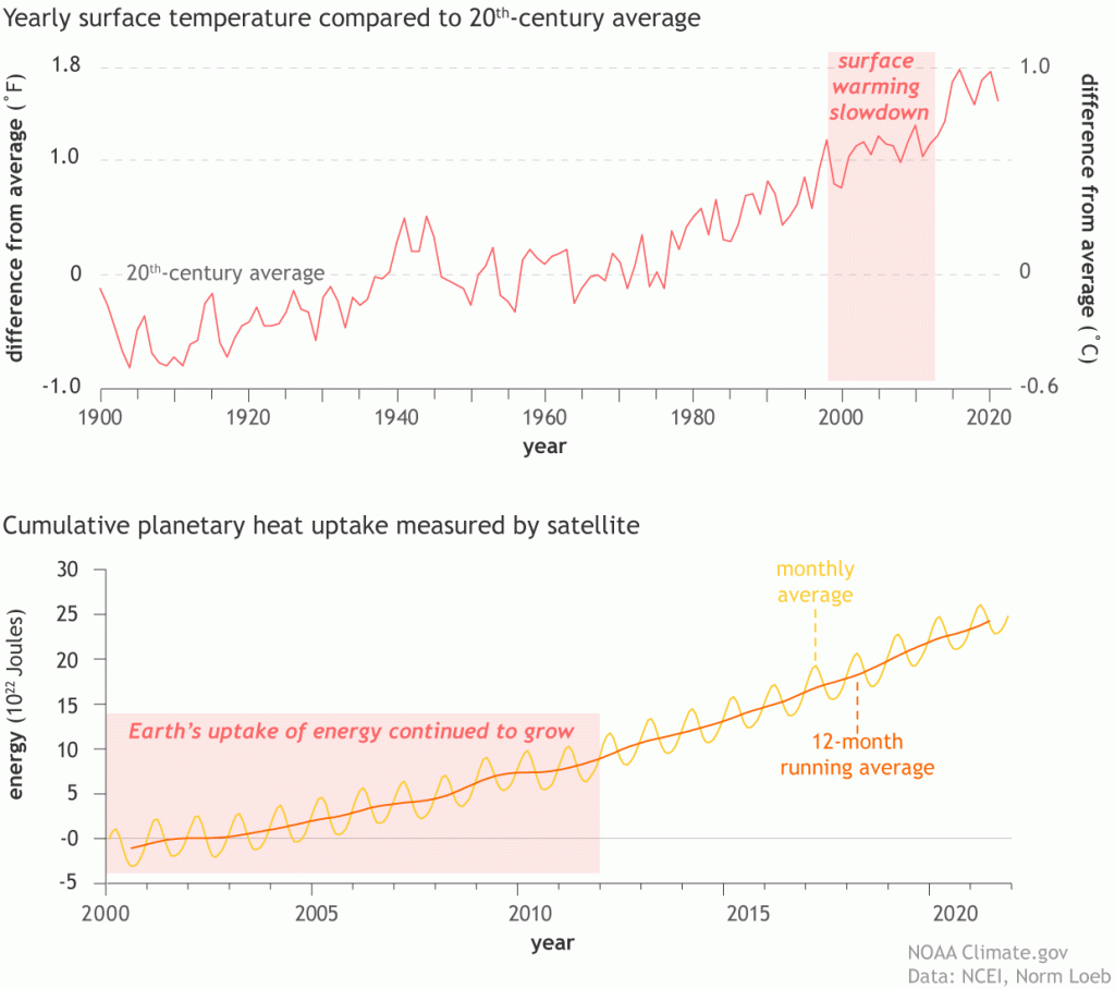 **Correction (11/1/22). The annotation in the shaded area of the bottom graph previously said “Earth’s energy imbalance continued to grow,” but energy imbalance usually refers to the rate of energy accumulation (which may remain constant), not the cumulative excess energy, which continues to grow.