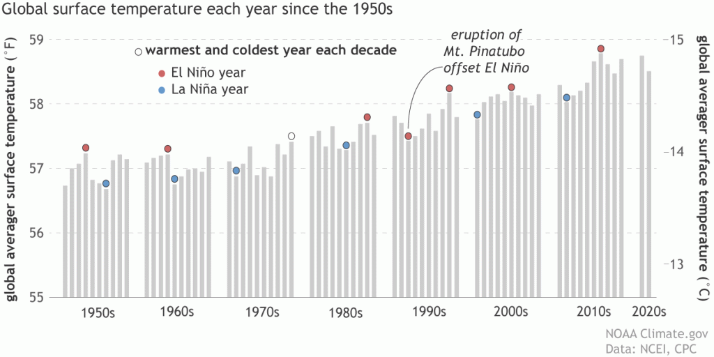 tell us theyāre boredĀ ask us whether all these La NiƱas could offsetĀ global warming.Ā The short answer is no, La NiƱa is no match for global warming.The simplest evidence is that global average temperature during recent La NiƱa years is warmer than for El NiƱo years in earlier decades! In fact, the La NiƱa year of 2020 tied 2016āa year that started with a major El NiƱoāas the all-time-record-high global surface temperature.