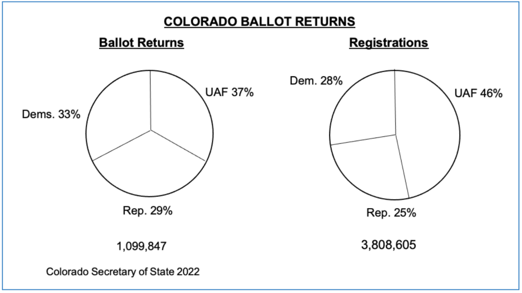 Unaffiliated voter registration began surging the last ten years during Colorado decade of rapid growth. It now is more than 700,000 votes ahead of each of the partisan parties. Registration is 46 percent of voters, a jump from 38 percent in 2018. Democrats are 28 percent, Republicans 25 percent.