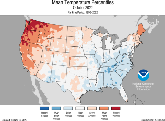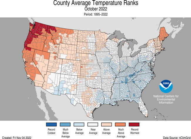 For the month of October, Washington ranked warmest on record, Oregon ranked second warmest, Maine sixth warmest and California ranked seventh warmest on record for this period.