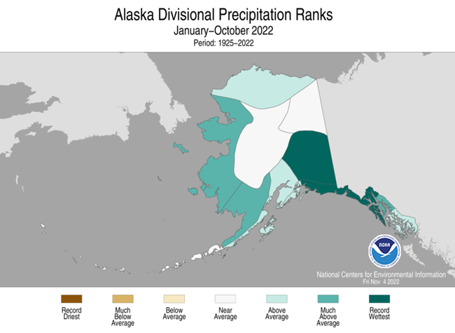 The January-October precipitation ranked wettest on record for Alaska, with above-average to record wet precipitation observed across much of the state. The central and Northeast Interior regions as well as the Aleutians experienced near-average precipitation for this period.