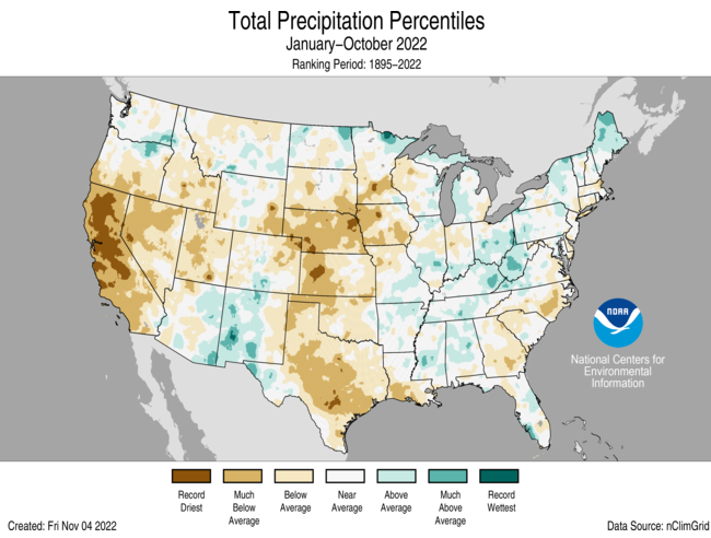 The January-October precipitation total for the contiguous U.S. was 23.19 inches, 2.17 inches below average, ranking 15th driest in the historical record. Precipitation was above average across portions of the Southwest, Mississippi, Tennessee and Ohio valleys as well as the Northeast. Precipitation was below average across much of the West, central and southern Plains and parts of the East Coast during the January-October period. California ranked driest on record while Nebraska ranked fourth driest and Nevada eighth driest for this 10-month period.