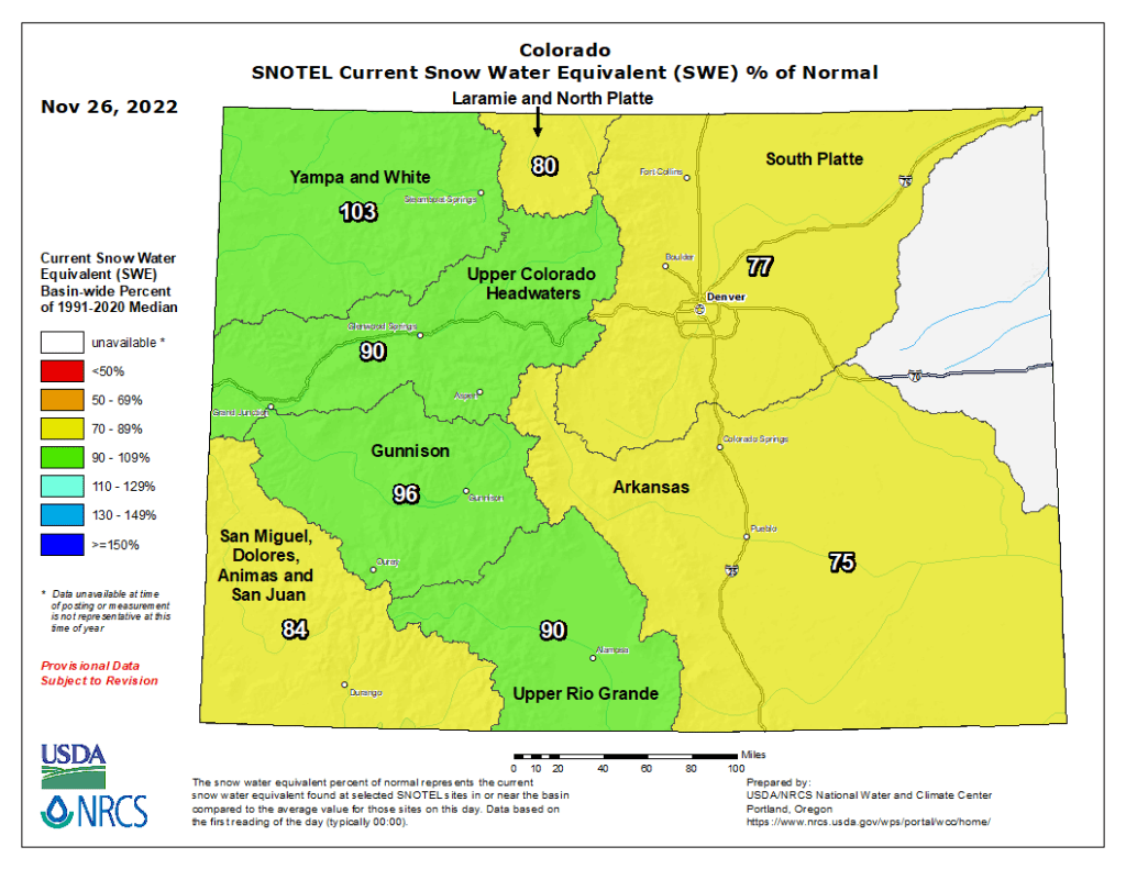 #Snowpack news November 27, 2022 #CRWUA2022 Westwide SNOTEL basin-filled map November 26, 2022 via the NRCS. Colorado snowpack basin-filled map November 26, 2022 via the NRCS. Share this: Share on Bluesky (Opens in new window) Bluesky Share on LinkedIn (Opens in new window) LinkedIn Share on Facebook (Opens in new window) Facebook Email a link to a friend (Opens in new window) Email Print (Opens in new window) Print Share on X (Opens in new window) X Like this:Like Loading...