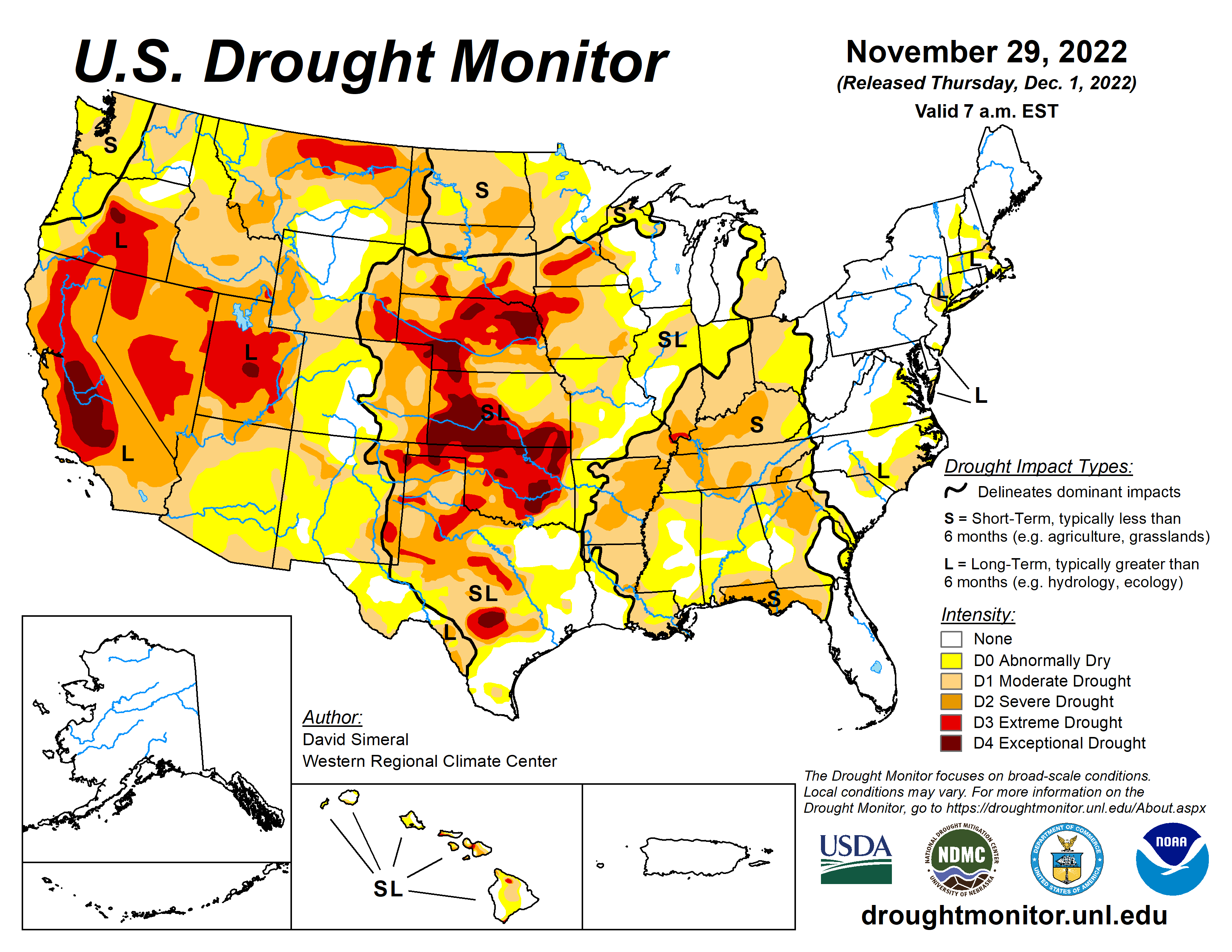 This U.S. Drought Monitor (USDM) week saw areas of moderate to heavy rainfall along the central and western Gulf Coast region as well as areas further inland in the eastern half of Texas, southeastern Oklahoma, and southwestern Arkansas. In these areas, targeted improvements were made in drought-affected areas. Additionally, an outbreak of severe weather, including severe thunderstorms with tornadoes and wind damage, impacted areas of the South (Louisiana, Mississippi, and Alabama) overnight on Tuesday (Nov 29), resulting in severe damage and loss of lives reported. In the Southeast, isolated heavy rainfall accumulations led to improvements on the map in areas of Alabama, Georgia, and North Carolina. Elsewhere in the Southeast, short-term dryness over the past 90 days led to expansion of areas of severe drought in the Florida Panhandle, where rainfall deficits ranged from 3 to 9+ inches. In the Northeast, only minor changes were made on the map in areas of eastern Massachusetts and Rhode Island in response to precipitation shortfalls during the past 30–60-day period as well as below-normal streamflow activity and lack of groundwater recharge in areas of Cape Cod. In the Midwest, areas of moderate drought expanded in southern Michigan and northern Illinois where short-term precipitation deficits are negatively impacting soil moisture and streamflow levels. In the High Plains, generally dry and warmer-than-normal temperatures (2 to 10+ deg F above normal) prevailed across much of the region during the past week. Out West, drought-related conditions improved in areas of Arizona, New Mexico, Nevada, Washington, Colorado, Wyoming, and Montana. In terms of snowpack conditions in the region, the Natural Resources Conservation Service (NRCS) SNOTEL network is currently reporting the following region-level (2-digit HUC) snow water equivalent (SWE) percentages of median for the date (Nov 29): Pacific Northwest 134%, California 135%, Great Basin 157%, Lower Colorado 152%, Upper Colorado 98%, Rio Grande 76%, Arkansas-White-Red 66%, Missouri 101%, and Souris-Red-Rainy 81%. Looking back at the last several months, the contiguous U.S. experienced its 8th warmest September-October period on record since 1895 in terms of average temperatures (+2.2-deg F anomaly) and maximum temperatures (+2.6 deg F), according to NOAA National Centers for Environmental Information (NCEI). Precipitation in the contiguous U.S. during the September-October 2022 period ranked as the 11th driest (-1.14-inch anomaly)…