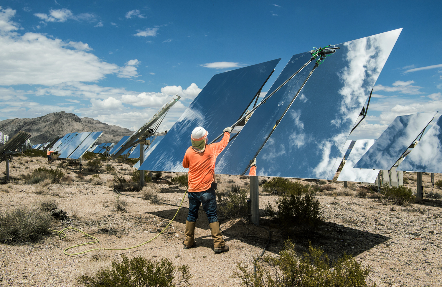 Contracted workers clean mirrors at the Ivanpah Solar Project in Nipton, California. In 2017, the facility employed over 65 workers and created 2,600 jobs during it’s three year construction period. Dennis Schroeder/National Renewable Energy Laboratory via The High Country News