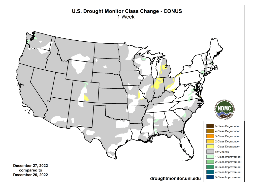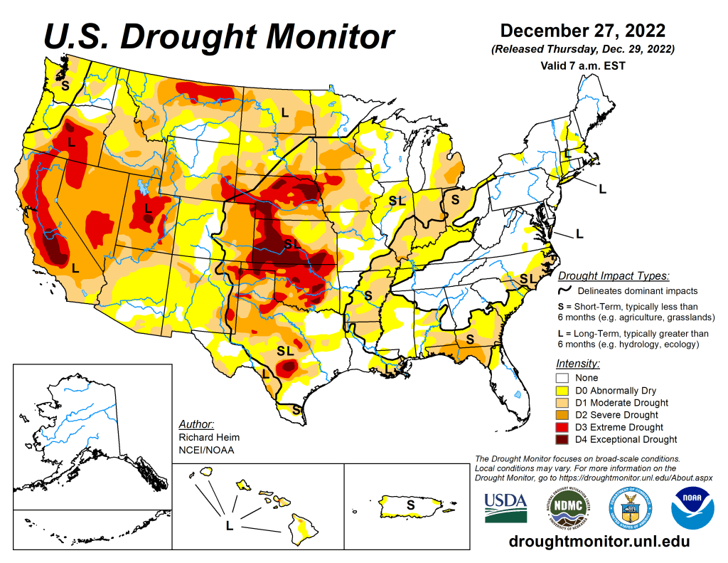 A powerful low-pressure trough developed in the upper levels of the atmosphere over the eastern contiguous U.S. (CONUS) during this U.S. Drought Monitor (USDM) week (December 21-27). At the surface, the trough was associated with a strong cold front that poured frigid arctic air into the U.S. east of the Rockies. Daytime maximum temperatures in the northern Plains were well below zero degrees Fahrenheit, with minimum temperatures colder than 20 below zero, at the peak of the cold wave. Bismarck, North Dakota, registered minus 10 for a high and minus 20 for a low on December 21 and 22; the high was below zero for 4 consecutive days and below freezing for at least 2 consecutive weeks. Williston, North Dakota, recorded minus 17 for a high and minus 29 for a low on December 20. The freezing arctic air spread to the Gulf of Mexico and East coasts, and even breeched the Rocky Mountain chain to reach the Pacific Northwest. The high temperature at Tupelo, Mississippi, was only 18 degrees with a low of 4 on December 23. Rain, freezing rain, and snow accompanied the arctic front as it swept east and south. An inch or more of precipitation fell across parts of the Gulf Coast and from the Appalachians to East Coast when the front tapped Gulf and Atlantic moisture. Some parts of the Mid-Atlantic and Northeast states received over 2 inches of precipitation, while an inch or more occurred over the lee sides of the Great Lakes, largely in the form of heavy lake effect snow. Buffalo, New York, officially measured 50.3 inches of snow from December 23-26, but much more snow fell in other favored leeside areas. Locally up to half an inch of precipitation occurred from the northern Plains to Upper Mississippi Valley. But the northwesterly flow was otherwise dry, so large parts of the Great Plains, Mississippi Valley, and Ohio Valley to Gulf Coast received less than half an inch of precipitation to no precipitation. The arctic blast froze soils across much of the Great Plains to Upper Mississippi Valley. Any precipitation that fell was not able to penetrate the frozen ground to increase soil moisture, so much of this region had no change in USDM status. In reaction to the eastern trough, an upper-level ridge developed over the western CONUS. This kept weekly temperatures near to warmer than normal from California to the Four Corners states, but it also kept much of the West dry. The exception was northern California to the Pacific Northwest and parts of the central and northern Rockies, where Pacific fronts brought areas of rain and snow. Two inches or more of precipitation fell in coastal areas and in the northern Rockies, with up to ten inches in parts of western Washington. Meanwhile Hawaii and Puerto Rico had a mostly drier-than-normal week while drier- and colder-than-normal weather dominated Alaska. The deep freeze and dry weather resulted in status quo conditions for much of the country. Drought or abnormal dryness expanded in parts of the Midwest, Colorado, and Puerto Rico, while contraction occurred in a few areas in the Southeast, East Coast, Wisconsin, Colorado, and Washington…