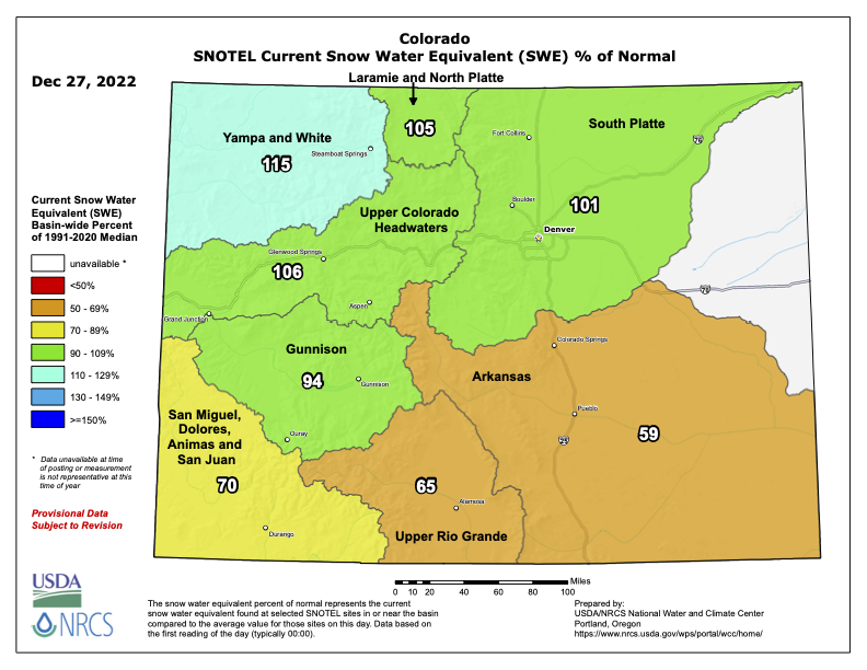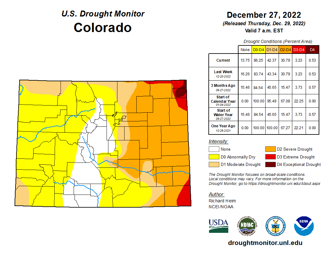 Most of the High Plains region received less than half an inch of precipitation. Pockets of half to 1 inch of precipitation were found over North Dakota and the mountains of Colorado and Wyoming. The precipitation was above normal in parts of all of the High Plains states, but late December is in the dry season for much of the region and normals are low. With the entire region experiencing a deep freeze this week, little change was made to the USDM depiction. The exception was Colorado, where D0 expanded in south central counties due to low snowpack and 1- to 4-month precipitation deficits, and D0-D1 contracted in north central counties based on precipitation surpluses at the 1-week to 3-month time scales…