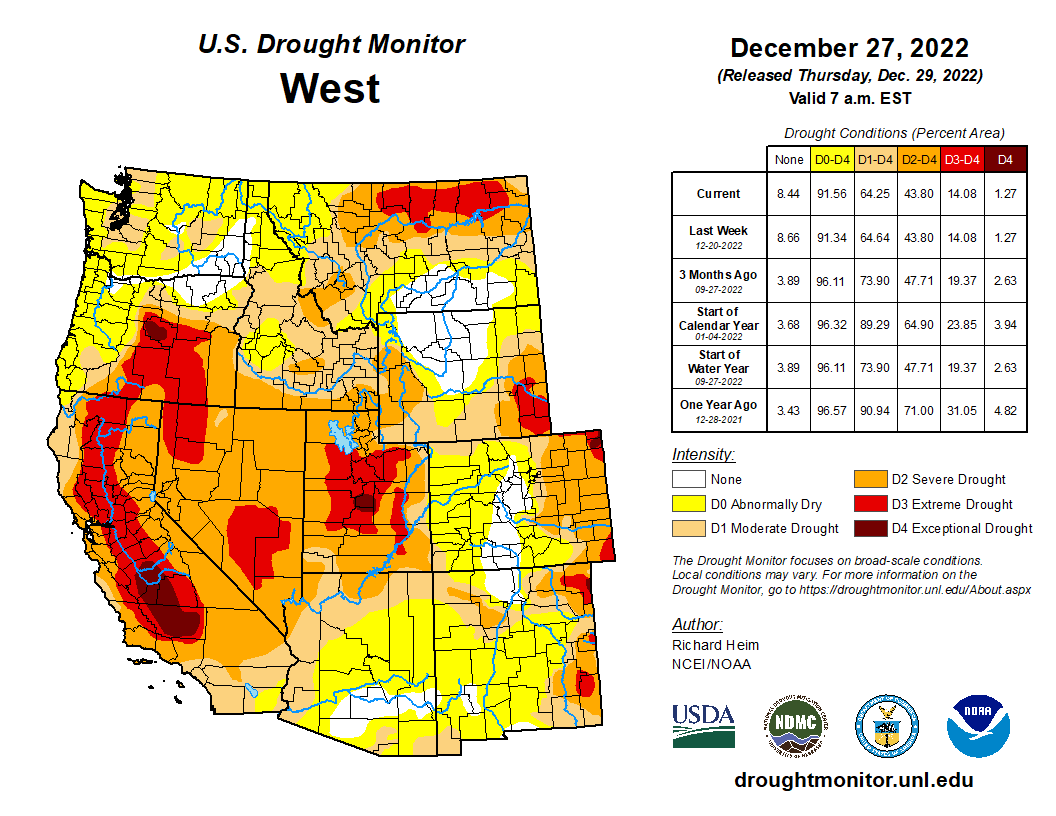 Pacific frontal systems brought rain and snow to coastal areas of the West, from northern California to Washington, and to parts of the Rockies. Two to 5 inches of precipitation fell along the coastal and Cascade ranges, with up to 10 inches locally in Washington. Amounts ranged up to 2 inches or more in the northern Rockies. Pockets of up to 1 inch of precipitation were found over the central Rockies, but for the states further south, southern California, and the intermountain basin, little to no precipitation occurred. Since this is the wet season in the Pacific Northwest, the heavy precipitation this week resulted in month-to-date totals that were barely above normal in some areas, and 3-month precipitation totals were still below normal across most of the Pacific Northwest. Very dry SPI values were still evident at the 6-month time scale in spite of this weekās precipitation. Soils were saturated and real-time and 7-day stream levels rose significantly in response to the rain, but 28-day streamflow levels, which are more relevant for drought monitoring, were still very low as of the Tuesday morning valid date of this USDM. Snow depth increased at some sites in northern Washington and the Idaho to Colorado mountains, but most locations in the Pacific Northwest experienced no change or a decrease in snow depth. Reservoirs in Oregon continued very low across the state, with some of the large reservoirs (e.g., Owyhee, Warm Springs, Prineville, Howard Prairie) less than 15% full. Most of the reservoirs across the Pacific Northwest saw very little change in reservoir levels since the beginning of the month. D1 was pulled back in those parts of Washington that had the heaviest precipitation and reflected improvement at 1- to 3-month time scales, but most of the D1 and the D0 were kept in place across the Pacific Northwest to reflect the aggregate indicators and conditions at all time scales. The bulk of the precipitation that fell in California occurred near the end of the USDM week. This precipitation, and the precipitation that followed after the Tuesday morning valid time, will be evaluated in next weekās USDM. No change was made to the rest of the West region outside of Washington…