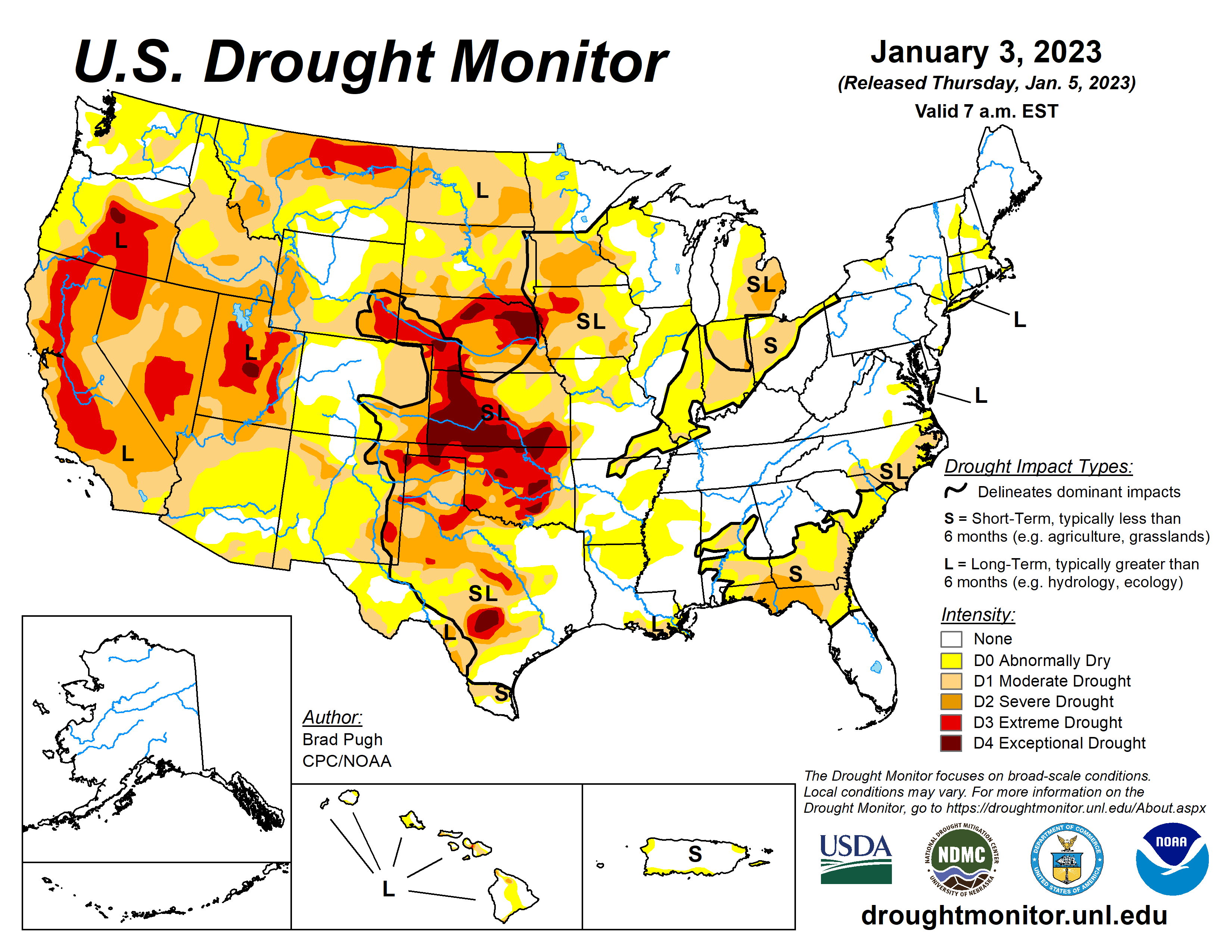 Based on heavy precipitation (1 to 3 inches, liquid equivalent) this past week along with above-normal snowpack, a 1-category improvement was made to western Colorado. Beneficial precipitation also prompted improving drought conditions across north-central and northeastern Colorado. A decrease in the spatial coverage of extreme (D3) drought was made to central Nebraska. 12-month SPI and the long-term blend support the continued widespread severe (D2) to exceptional (D4) drought coverage for the central Plains. Norfolk, Nebraska, with a period of record dating back to 1888, had its driest year on record in 2022…