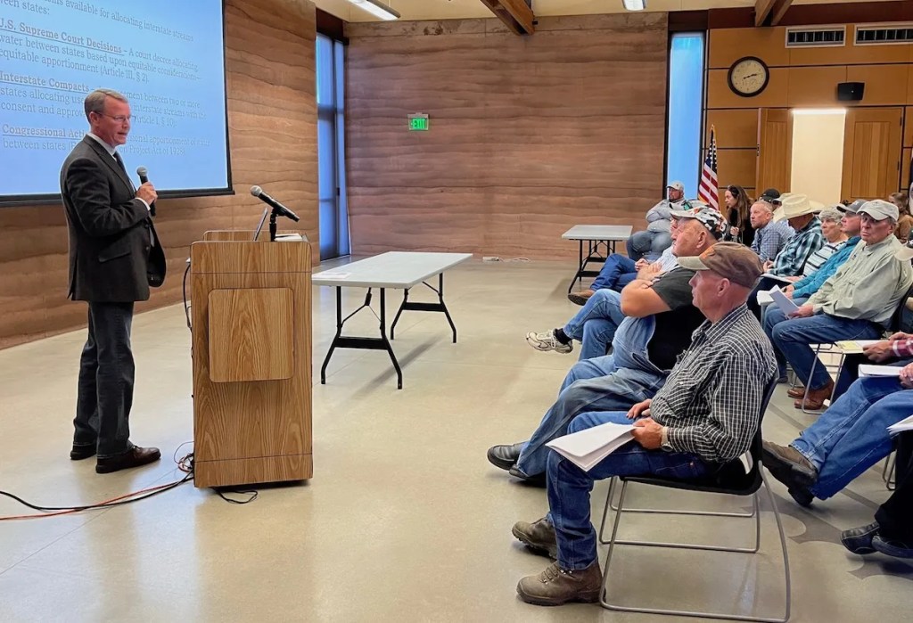 Chris Brown of the Wyoming Attorney General’s Office discusses the implications of the Colorado River Compact with water users in Pinedale Sept. 27, 2022. (Dustin Bleizeffer/WyoFile)