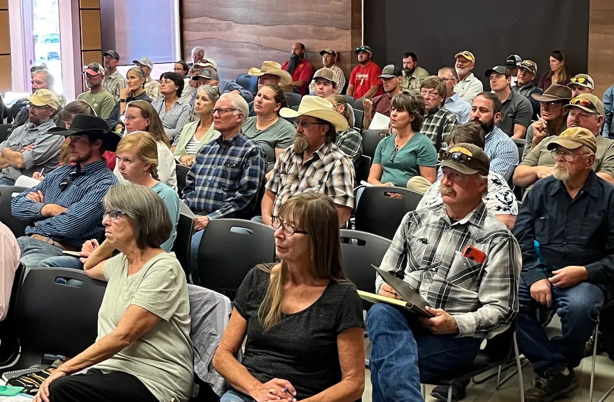 Members of the public packed the Sublette County Public Library in Pinedale Sept. 27, 2022 for a water meeting organized by the Wyoming State Engineer’s Office. (Dustin Bleizeffer/WyoFile)