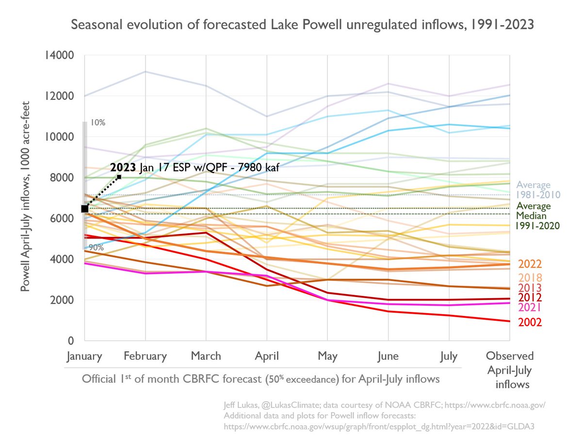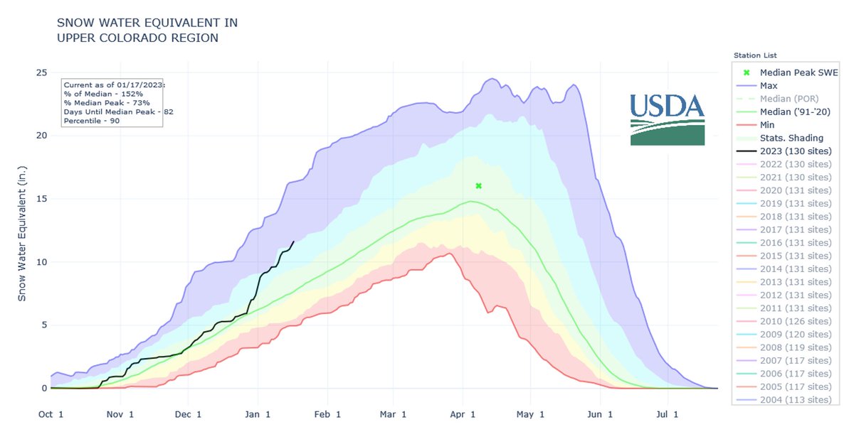 Upper Basin now at >150% of the median SWE for mid-January, and almost 75% of the peak SWE–about three months ahead of the typical peak.