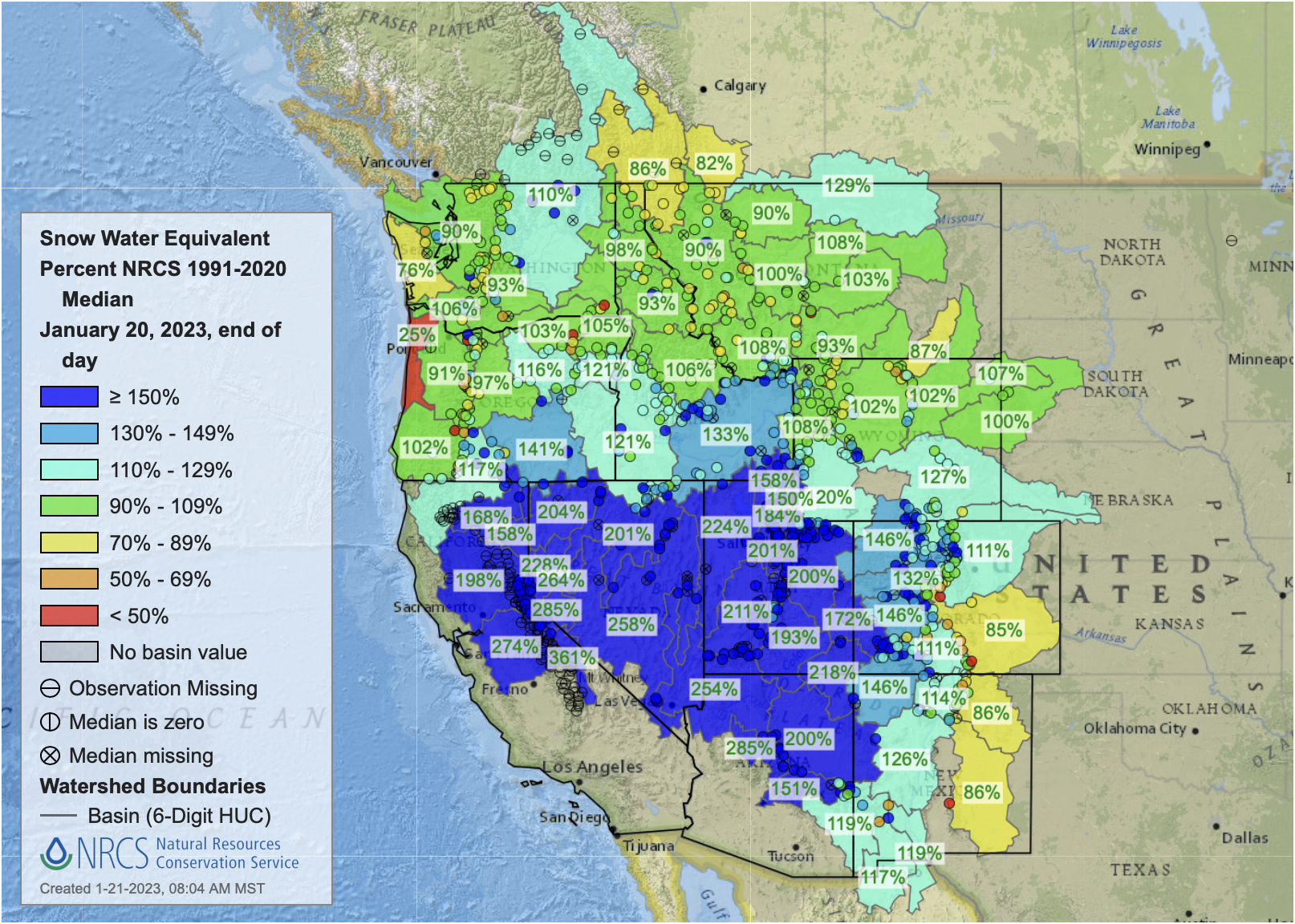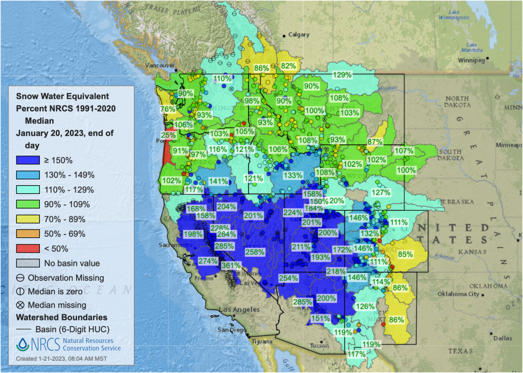 Bolinger:Ā Thanks to an active storm pattern throughout December and January, our statewide snowpack is currently (as of Jan. 18) at 134% of average. With the latest storm numbers still coming in, that number is likely to go up. Statewide, it is very likely that peak snowpack, which usually occurs in early April, will be near or above average. This is great news. Because of this consistent storm activity, we have seen improvements in drought conditions over our Colorado mountains for theĀ past two months.