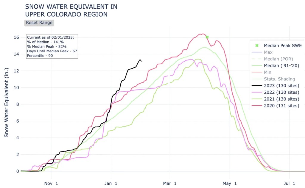I don’t want to jinx it, but maybe, just maybe, this is going to be one of those good spring runoff years of yore. The snow is piling up at above average rates, but it is still early: We may be two-thirds of the way through meteorological winter (Dec-Feb), but not even halfway through the big snow season, which can stretch into May. There’s still time for the snow-deluge to turn to drought.