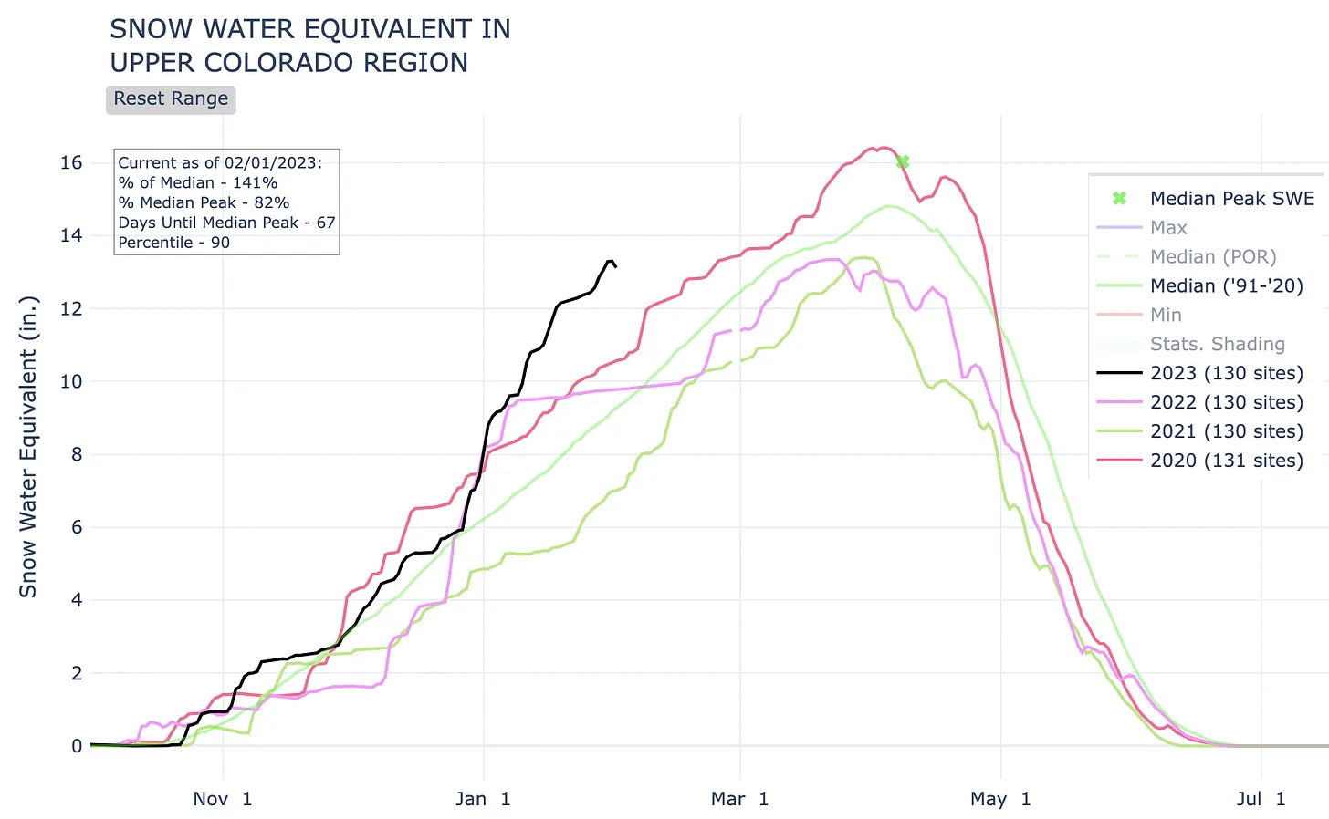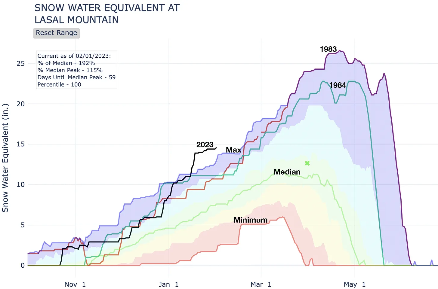 But what the hell, I’m gonna celebrate. Because you know what? There’s a s%$t-ton of snow out there, which is great for the ski areas and the rivers, sure, but best of all it means even lowlanders can go nordic skiing at the golf course, just like in the good ol’ days. Here’s some of the graphs that really stood out for me: