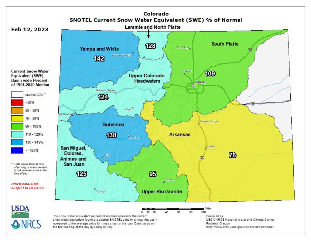 #Snowpack news February 13, 2023 West snowpack basin-filled map February 12, 2023 via the NRCS. Colorado Snowpack basin-filled map February 12, 2023 via the NRCS. Share this: Share on Bluesky (Opens in new window) Bluesky Share on LinkedIn (Opens in new window) LinkedIn Share on Facebook (Opens in new window) Facebook Email a link to a friend (Opens in new window) Email Print (Opens in new window) Print Share on X (Opens in new window) X Like this:Like Loading...