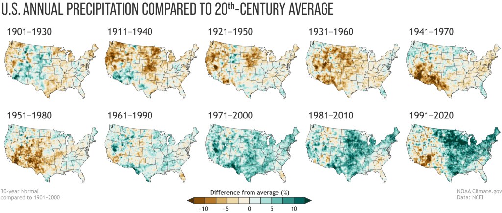 That, understandably, irks some folks, since it seems like a rather short period of time to use to define “normal.” Also, if those three decades were, say, drier than the decades that preceded them, wouldn’t that skew things? Why not go back to the beginning of record keeping? The National Weather Service has an answer: the criteria was chosen by the international meteorological community in the 1930s because many countries didn’t have reliable record keeping prior to 1900. So, the thirty-year standard was a bit of an accident of timing, and it stuck.
