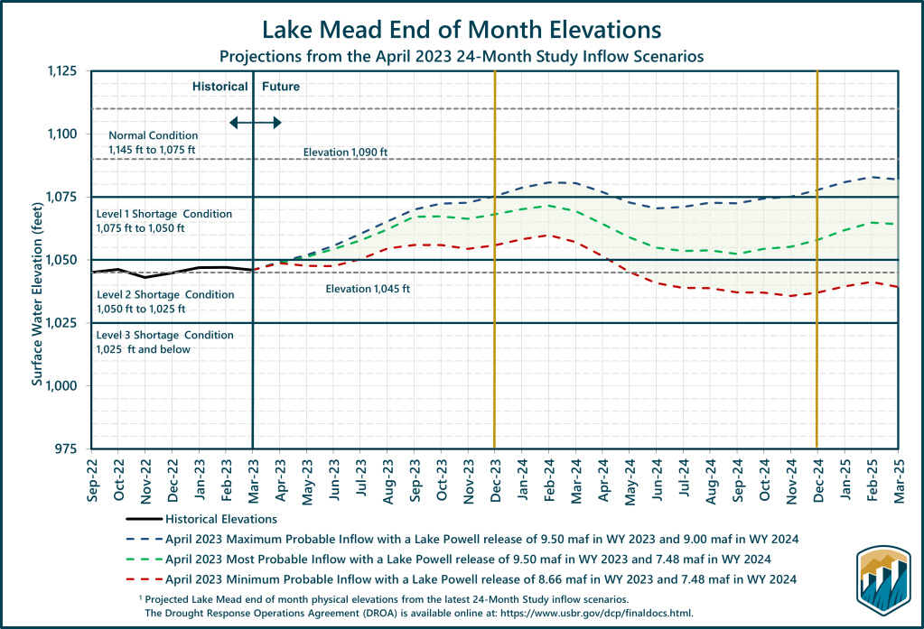 Based on the April 24-Month Study, Lake Meadās elevation is also projected to improve in calendar year 2023, with a projected end of calendar year elevation of 1,068.05 feet ā approximately 33 feet higher than the March 24-Month Study. With this improvement in Lake Meadās elevation, a mid-year review of Lake Mead operations is not expected in 2023.