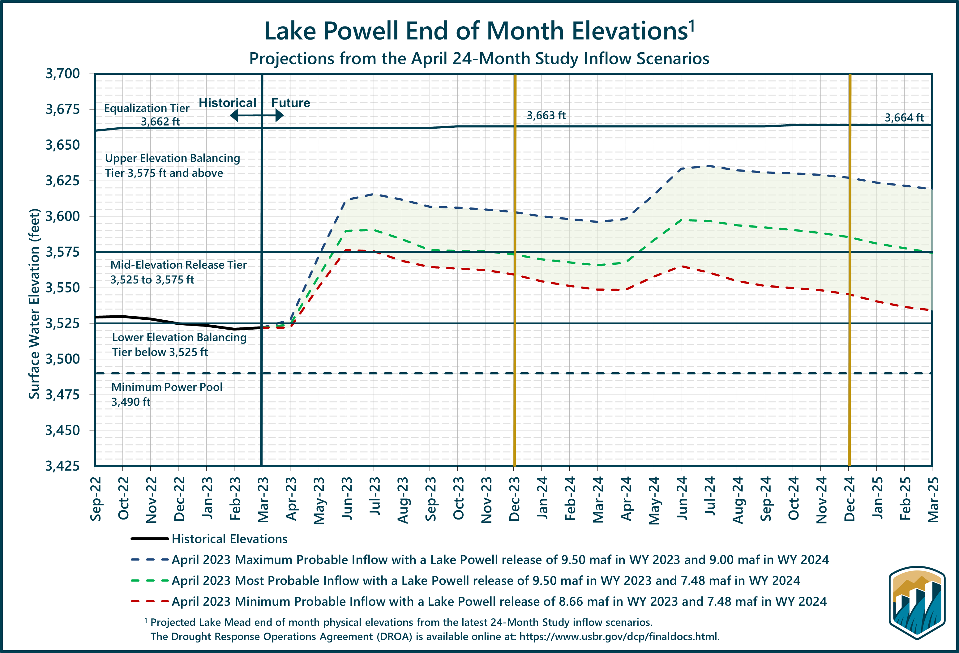 The CBRFCās April through July unregulated inflow forecast for Lake Powell is 11.3 maf (177% of average) ā an increase of 3.3 maf from March, which was 125% of average. Reclamationās April 24- Month Study projects Lake Powellās elevation at 3,576.50 feet at the end of the water year (Sept. 30, 2023). This is approximately 40 feet higher and 2.74 maf of additional storage than projected in the August 2022 Most Probable 24-Month Study, which was used to set the annual operations for Lake Powell and Lake Mead.