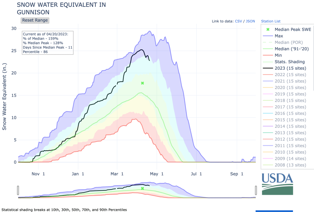 This season, snowpackĀ peakedĀ on April 7 with 23.2 inches of snow-water equivalent, about five inches above average, according to the USDA. Consistent snowfall throughout the season contributed to the 35% above-average count ā the highest snowpack for the second week of April since 2019. Experts said it is still too soon to tell exactly what the snowmelt pattern will look like. Factors like temperature, wind, and dust will play into that rate…