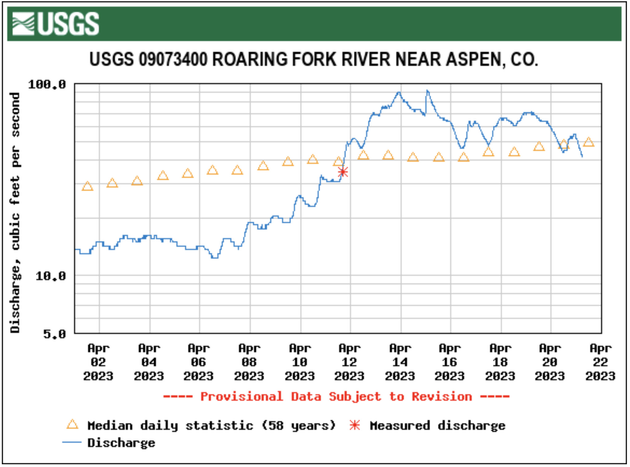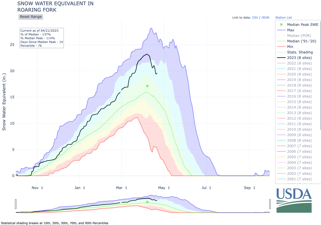 If temperatures continue to rise and wind storms blow away top layers of snow or carry in dirt ā the most detrimental to snowpack ā rivers could swell and lead to strong flow or even flooding. Or if cold weather like Friday continues, the snowmelt could come at a more even pace all the way into July. Normal peak runoff season in the Roaring Fork watershed is mid-May through mid-June.Ā [Erin] Walter said elevation also plays a huge role in the rate of snowmelt. The highest elevations hold out the longest.Ā Another factor in extending the runoff season is better soil moisture at the beginning of winter than in seasons past.Ā