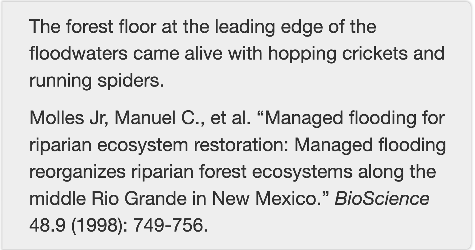 What we’re seeing this spring on the fringes of the Rio Grande bears so little resemblance to the valley-wide ecosystem that it seems cheap to even compare, but the careful work of Cliff Crawford, Manual Molles, and their colleagues three decades ago trying to address this question – What would happen if we reintroduced just a bit of flooding to the forests on the river’s edges? – nevertheless draws a critical connection between the Rio Grande and the community that surrounds it.