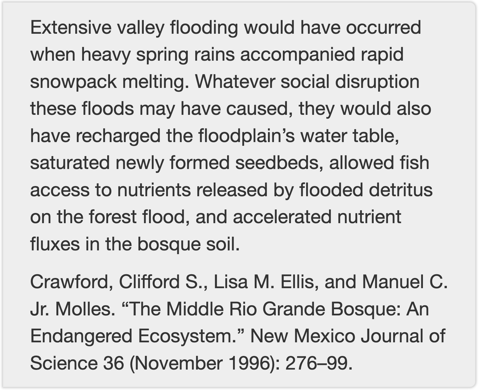 From time immemorial, this must have been a near-annual event, as the crickets and spiders scurried ahead of rising water each spring as the Rio Grande spread across the valley floor – bad for people trying to live here, great for the flora and fauna. From the same group of authors: