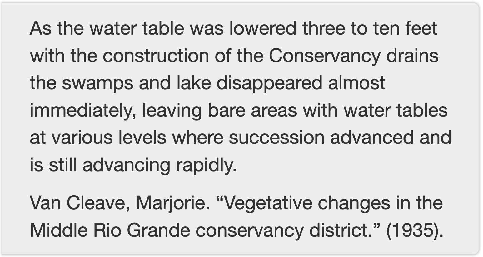 We understand what happened next thanks to a University of New Mexico biology student named Marjorie Van Cleave, who for her 1935 masters thesis documented the change. In that historic moment, plants and animals dependent on the wetlands spread across the valley floor disappeared.