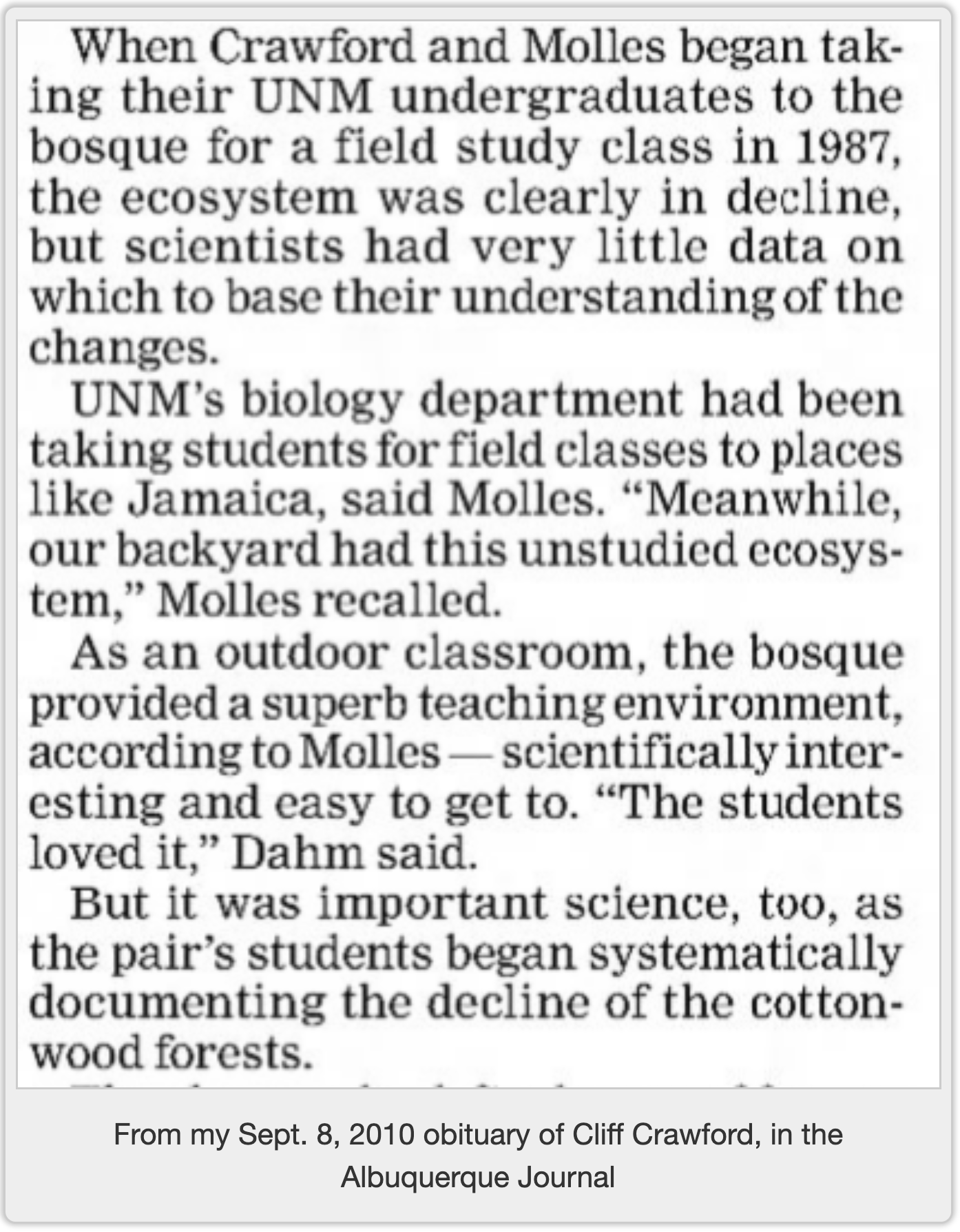 I can’t find the newspaper story I wrote based on a visit to the bosque with Cliff Crawford and his then-grad student and now my good friend Mary Harner. But I did find the obituary I wrote when Cliff died in 2010.