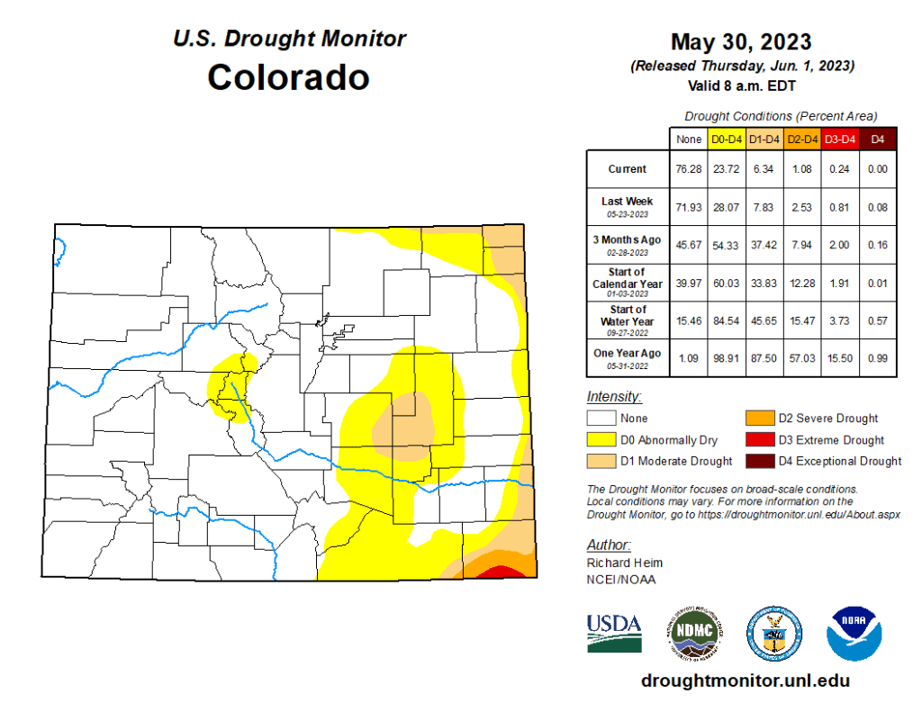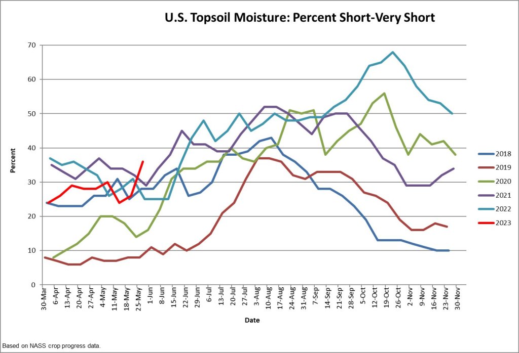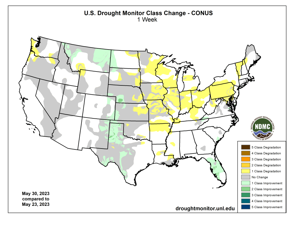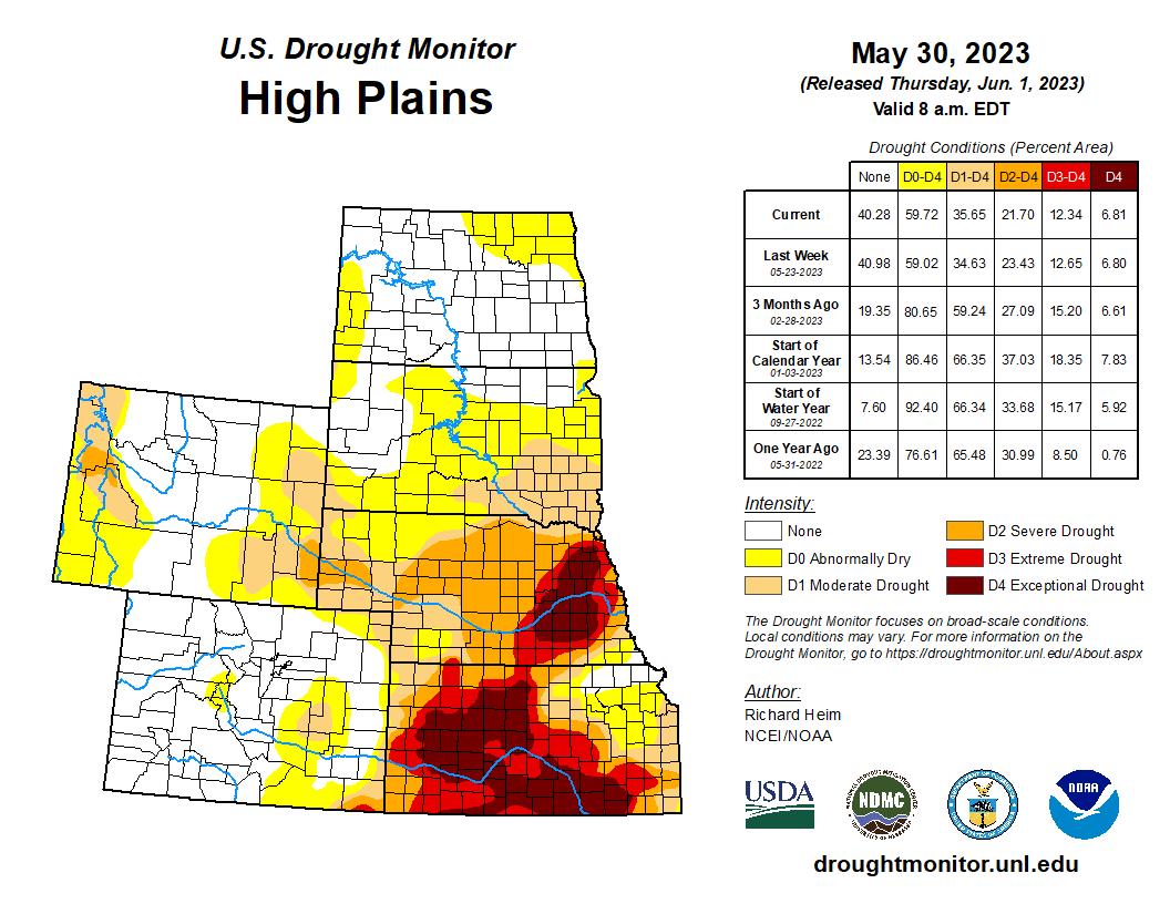 Locally heavy rain fell over western parts of the High Plains region while eastern parts had a dry week. Several stations in southwest Nebraska received over 5 inches of rain during this USDM week, with 10 inches reported near McCook. The rain replenished soil moisture, but caused extensive flooding. The rain caused a 2-category improvement in drought conditions in southwest Nebraska. Two inches or more of rain fell in localized parts of northeast Colorado, western Kansas, northeast Wyoming, and the western Dakotas, prompting pullback of abnormal dryness or moderate to exceptional drought. But continued dry conditions in the eastern portions of the region resulted in expansion of abnormal dryness or moderate drought in the Dakotas, abnormal dryness to extreme drought in eastern Kansas, and severe to exceptional drought in eastern Nebraska. Based on May 28 USDA data, 69% of the winter wheat crop in Kansas and 51% in Nebraska was in poor to very poor condition, and more than 40% of the topsoil moisture was short or very short in Nebraska (57%), Kansas (50%), and South Dakota (46%). More than two-thirds of the subsoil moisture was short or very short in Nebraska (75%) and Kansas (68%)…