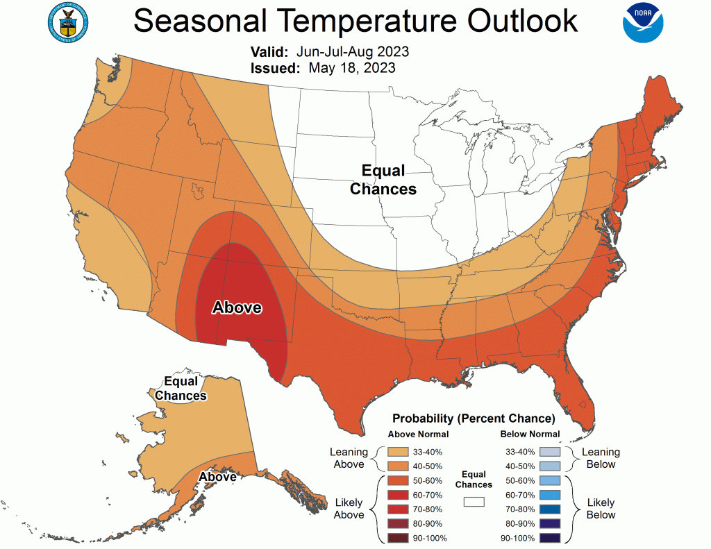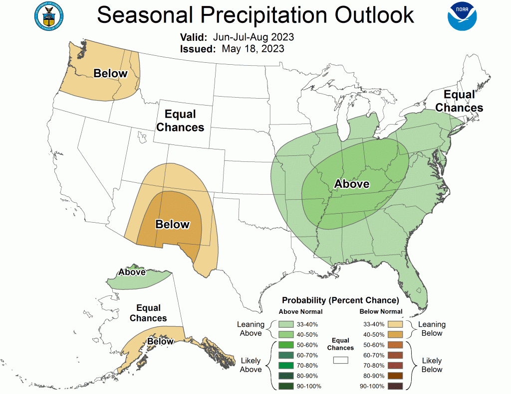 For June 6-14, a warmer-than-normal pattern is likely for the Pacific Northwest to western Great Lakes, the northern half of Alaska, and the Alaska panhandle, with cooler-than-normal temperatures across southern portions of the West, the southern Plains, and from the Appalachians to New England. Odds favor wetter-than-normal conditions across the West, southern Plains, western portions of the central to northern Plains, and the southwest half of Alaska, with drier-than-normal conditions across the Great Lakes, Upper Mississippi Valley, Ohio Valley, and northeast Alaska.