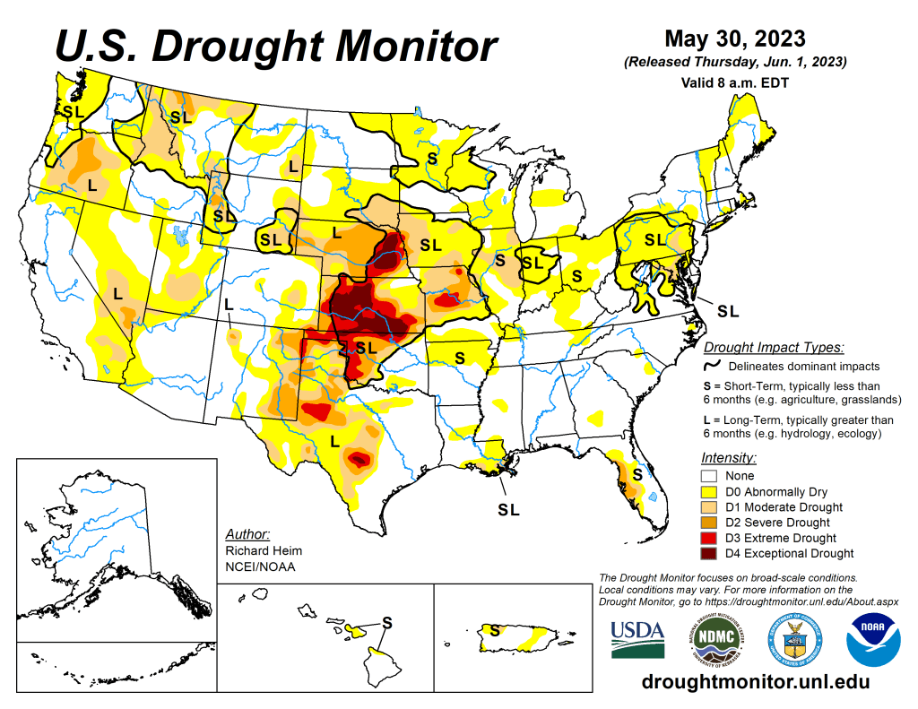 Western parts of the South region were wet, while eastern parts were mostly dry. Extreme eastern Tennessee received some rain from the Southeastās cutoff low, but dry conditions dominated across Arkansas, Louisiana, Mississippi, and Tennessee. D0 expanded in parts of these states. Heavy rain inundated parts of western Texas and Oklahoma, causing contraction of abnormal dryness and moderate (D1) to exceptional (D4) drought. Over 5 inches of rain was recorded at several stations in the Texas panhandle. Soils were wet, streamflow was high, and 6-month precipitation deficits were erased across much of the Texas panhandle. D3 (extreme drought) expanded in Oklahoma just east of where it rained. May 28 USDA data revealed 40% of the winter wheat crop in Texas was in poor to very poor condition…