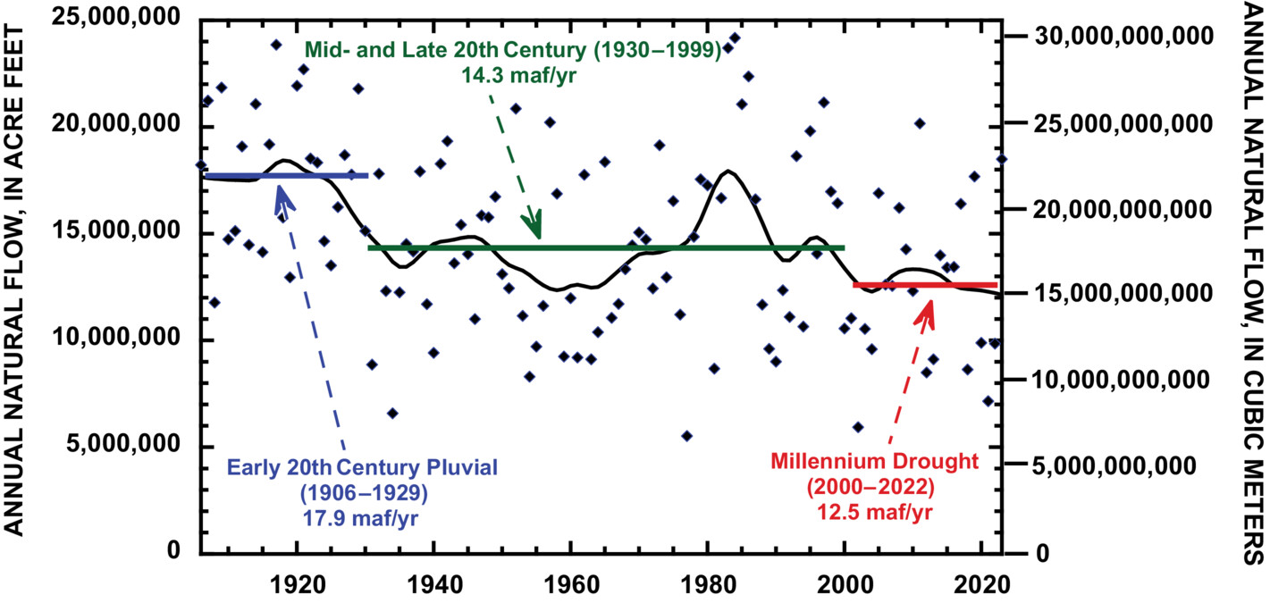 The black line meandering through the graph is a smoothing curve tracing the general up-or-down-and-how-far of the erratic annual flows of the river (the little black dots peppered all over the graph). But the genius of their analysis is in the three horizontal lines. They’ve divided the 117 years for which we have some semblance of measures for Colorado River’s flows into three fairly distinct periods: The Early 20th-Century Pluvial (two-bit word for ‘really wet period’) when the river averaged almost 18 million acre-feet a year (maf/yr) for a quarter-century; then the six-decade Mid to Late Century period when the river averaged 14.3 maf/yr; and then what they’ve chosen to call the Millennium Drought in which the river has only averaged flows of 12.5 maf/yr. (I would just call it ‘The Anthropocene.’)