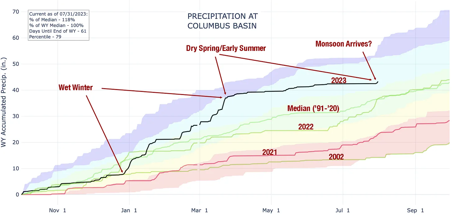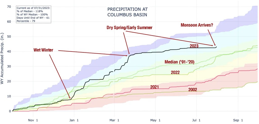 Here’s a look at precipitation at the Columbus Basin SNOTEL site in the La Plata Mountains of southwestern Colorado. There were big snows from late December into March, then someone turned off the taps it seems and the usual mountain rains didn’t materialize in early July, per normal. Now it’s just started raining. Let’s hope it keeps up.