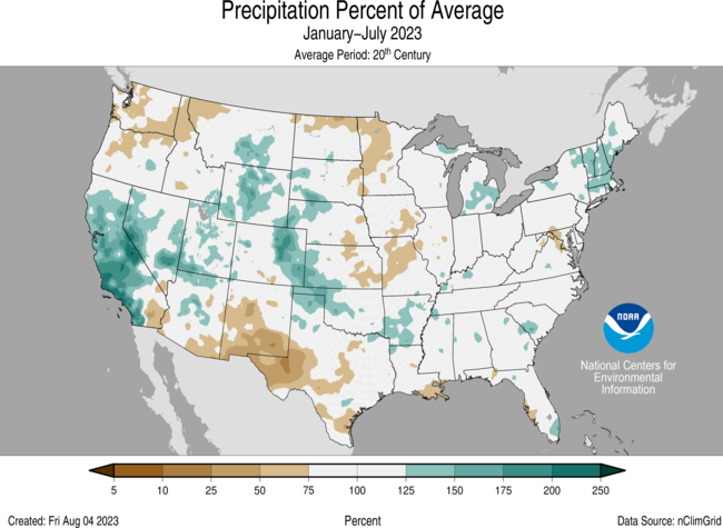 The January–July precipitation total for the contiguous U.S. was 18.41 inches, 0.32 inch above average, ranking in the middle third of the 129-year record. Precipitation was near to above average from California to the western Great Plains, Northeast, and in parts of the southern Mississippi Valley, northern Great Lakes and Southeast. New Hampshire had its fifth wettest year-to-date period on record while two additional states ranked among their top-10 wettest for this period. Conversely, precipitation was below average across parts of the Northwest, eastern Plains, Southwest, central Mississippi Valley, Mid-Atlantic and along parts of the Gulf during the January–July period. Maryland had its 10th-driest January–July on record.
