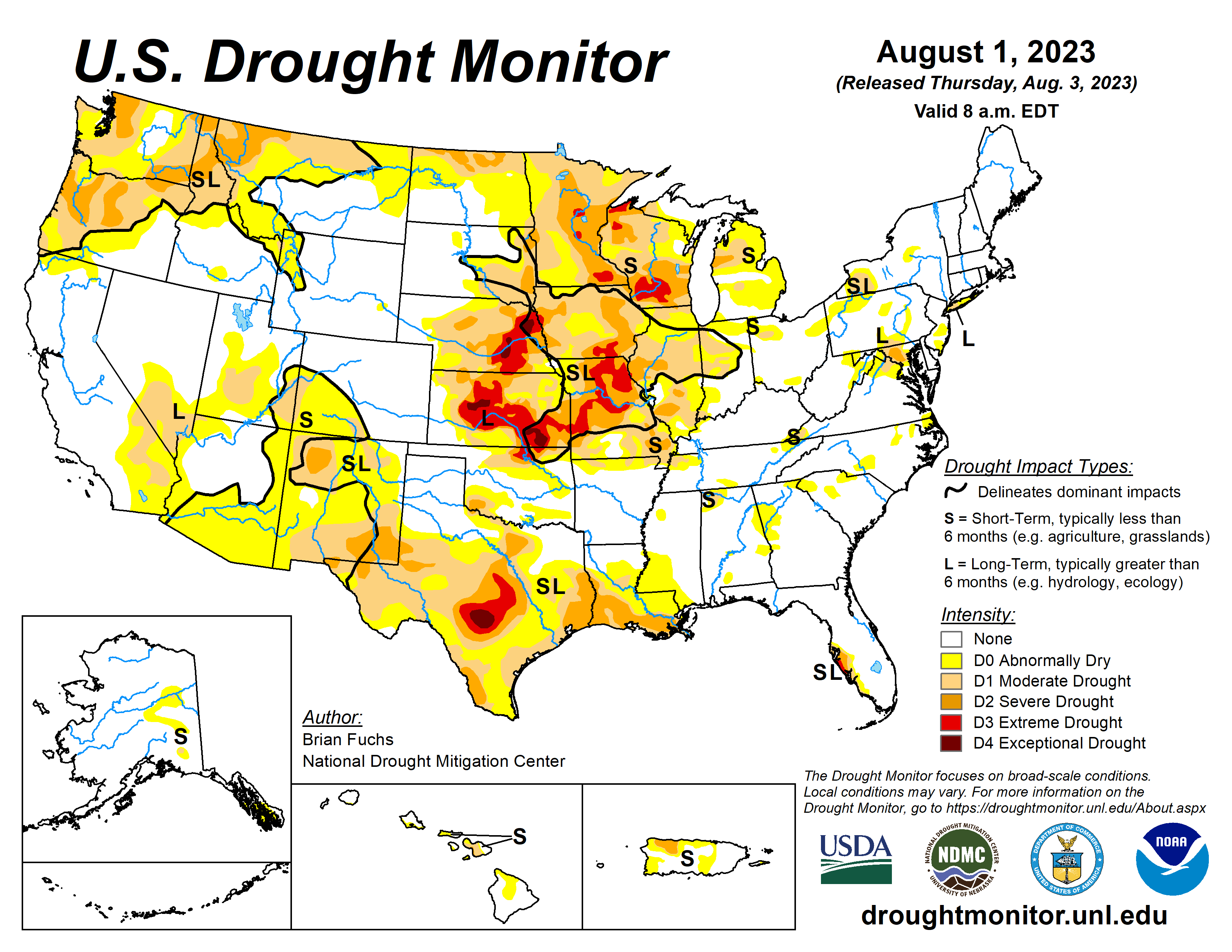 According to the August 1 U.S. Drought Monitor report, about 28.1% of the contiguous U.S. was in drought, up about 1.2% from the beginning of July. Moderate to exceptional drought was widespread across much of the Great Plains, with moderate to extreme drought in much of the Midwest and Florida Peninsula. Moderate to severe drought was present in parts of the Northwest, Southwest, southern Mississippi Valley, Mid-Atlantic, Michigan and Puerto Rico as well as moderate drought in parts of the Northeast and Alaska.