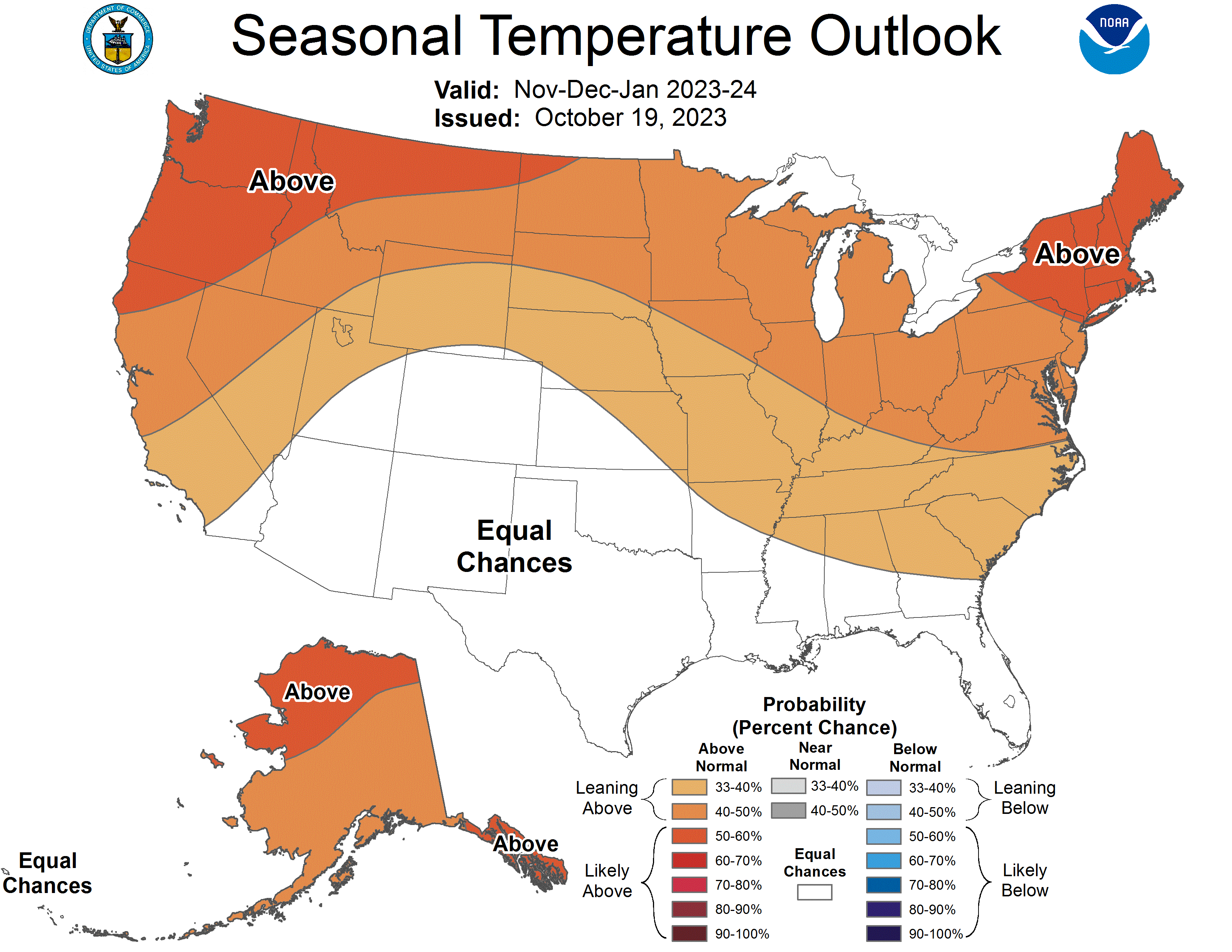 The Climate Prediction Centerās 6-10 day outlook (valid October 23-27, 2023) favors near to above-normal precipitation throughout much of contiguous U.S., Alaska and Hawaii with below-normal precipitation most likely across the East Coast and in parts of southeast Alaska and on the Big Island in Hawaii. Increased probabilities for above-normal temperatures are forecast from the Plains to the East Coast, as well as much of Alaska and Hawaii, while below-normal temperatures are likely across much of the West.