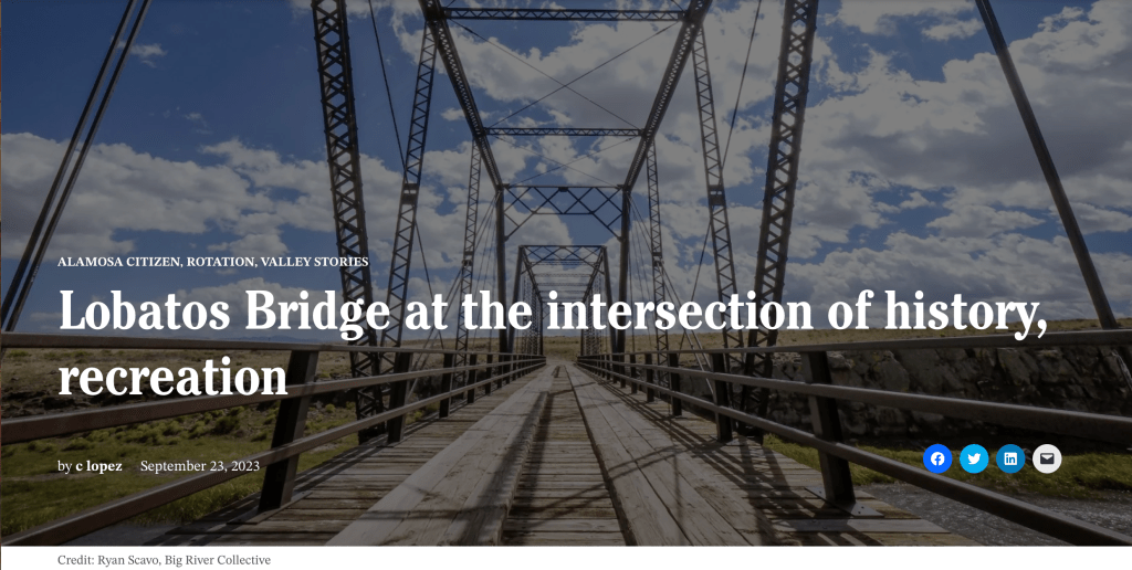 It is with this understanding that two efforts are underway to carefully and thoughtfully showcase the public land corridors of the Lobatos Bridge and the Rio Grande Natural Area. The U.S. Bureau of Land Management is moving forward on creating the Lobatos Bridge Recreation & Interpretive area to showcase its history and to provide boat access and other recreational opportunities on the Rio Grande at Lobatos Bridge. BLM officials, along with champions of the project which include the Sangre de Cristo National Heritage Area and San Luis Valley Great Outdoors, met this month with residents of Conejos County to update them on a timeline for an educational outdoor classroom and public recreation in place come late 2024. Key to the timeline is an upcoming decision from Great Outdoors Colorado to provide grant funding.A separate push is underway in Conejos County to revive the idea of connecting the Rio Grande corridor for recreational purposes from the Alamosa Wildlife Refuge through the Lobatos Bridge passageway and into northern New Mexico and the Rio Grande Gorge Bridge near Taos. It’s a conversation fraught with lessons learned from the last time the idea of creating a national monument area between the two states and along the Rio Grande was tried and met with distrust.