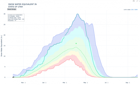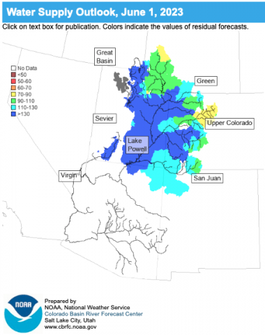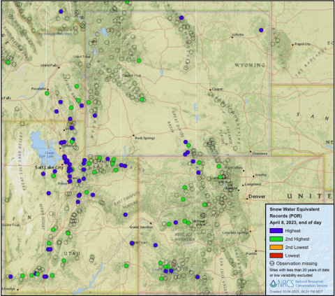 April 1st snow-water equivalent was above average to much-above average for nearly all river basins in Colorado, Utah, and Wyoming. Many river basins and individual SNOTEL sites received record SWE accumulation during the 2023 water year; as a statewide average Utah received record SWE accumulation in 2023, breaking the previous record set in 1983. The largest snowpacks were found in Utah and western Colorado including record SWE accumulation in the Lower Bear, Dolores, Lower Green, Jordan, Lower San Juan, and Weber River Basins.