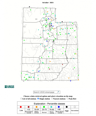 October streamflow conditions in the Upper Colorado River Basin were above normal in the Upper and Lower Green River Basin, near-normal in the White-Yampa River Basin, and below normal in the Colorado River Headwaters, Gunnison, Dolores, and San Juan River Basins. Most locations in the Utah portion of the Great Basin experienced normal to much-above normal streamflow conditions. Rivers in Wyoming also experienced normal to above normal streamflow conditions with much-above normal conditions in the Big Horn, Tongue, and Powder River Basins.