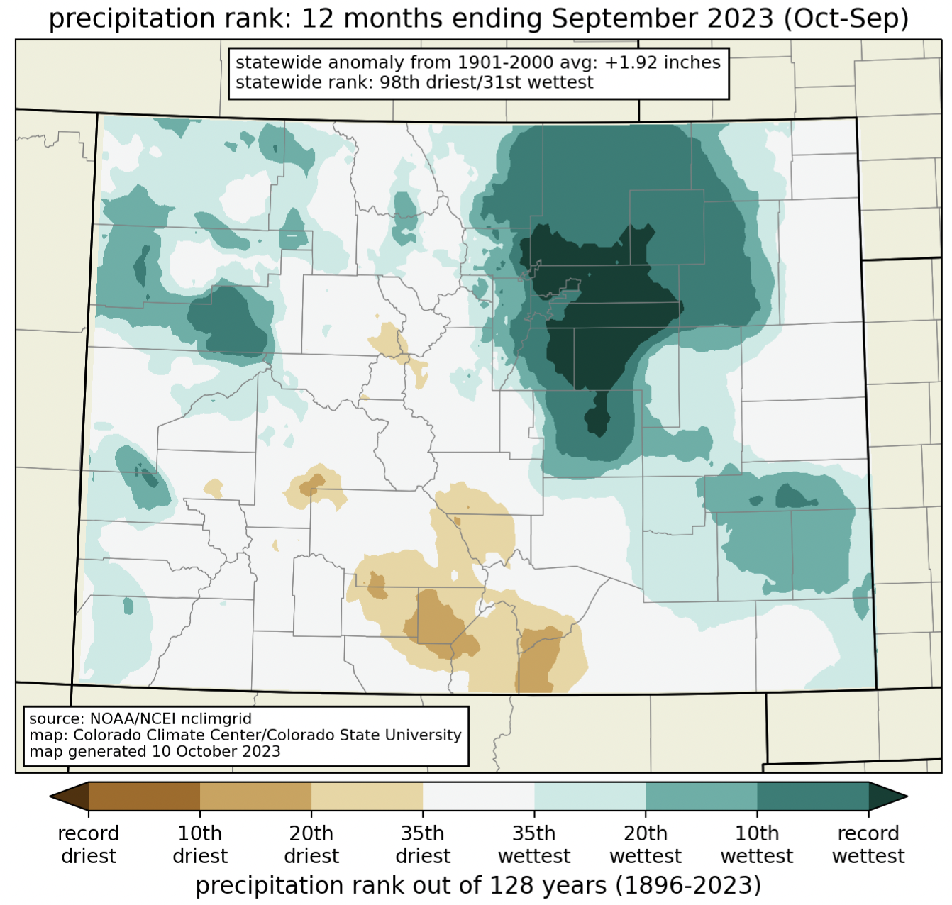 Only the 31st wettest year on record but…Record wet in portions of Weld, Morgan, Boulder, Adams, Denver, Arapahoe, Washington, Elbert, Douglas, and El Paso Counties. Drier than normal for San Luis Valley.