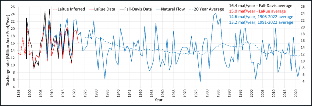 La Rue argued that decisionmakers should use longer-term averages in estimating river discharge. Prior to 1899, there were no stream discharge measurements in the Colorado River Basin. La Rue creatively used water level records from Great Salt Lake in Utah, calibrated against later records of river discharge and lake levels, to infer earlier annual Colorado River discharges back to 1895 [La Rue and Grover, 1916; La Rue et al., 1925] (dashed red curve in Figure 2). Decades later, La Rue’s inferred discharges for those early years were found to be consistent with discharge values estimated from tree ring studies [Meko et al., 2007]. The different approaches of La Rue and Fall and Davis led to a disparity in their discharge estimates of approximately 1.4 million acre-feet per year.