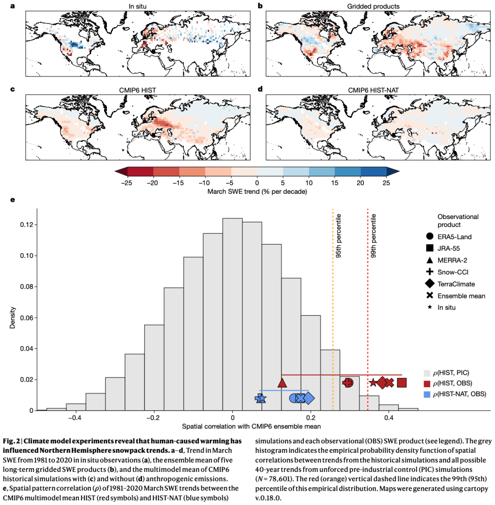 Documenting the rate, magnitude and causes of snow loss is essential to benchmark the pace of climate change and to manage the differential water security risks of snowpack declines. So far, however, observational uncertainties in snow mass have made the detection and attribution of human-forced snow losses elusive, undermining societal preparedness. Here we show that human-caused warming has caused declines in Northern Hemisphere-scale March snowpack over the 1981–2020 period. Using an ensemble of snowpack reconstructions, we identify robust snow trends in 82 out of 169 major Northern Hemisphere river basins, 31 of which we can confidently attribute to human influence. Most crucially, we show a generalizable and highly nonlinear temperature sensitivity of snowpack, in which snow becomes marginally more sensitive to one degree Celsius of warming as climatological winter temperatures exceed minus eight degrees Celsius. Such nonlinearity explains the lack of widespread snow loss so far and augurs much sharper declines and water security risks in the most populous basins. Together, our results emphasize that human-forced snow losses and their water consequences are attributable—even absent their clear detection in individual snow products—and will accelerate and homogenize with near-term warming, posing risks to water resources in the absence of substantial climate mitigation.