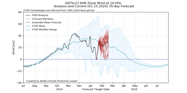 This lower stratosphere disturbance has been affecting the winds above it and looks to become just strong enough to fully reverse the winds of the polar vortex in the mid-stratosphere. A major sudden stratospheric warming is forecast to likely occur tomorrow. Normally, that’s when the excitement about whether we’ll see any surface impacts begins, as changes in the polar vortex communicate their way down to the lower stratosphere and sometimes the troposphere. But since the lower stratosphere has been perturbed for a while now, we’ve already been on the lookout for changes in the troposphere.