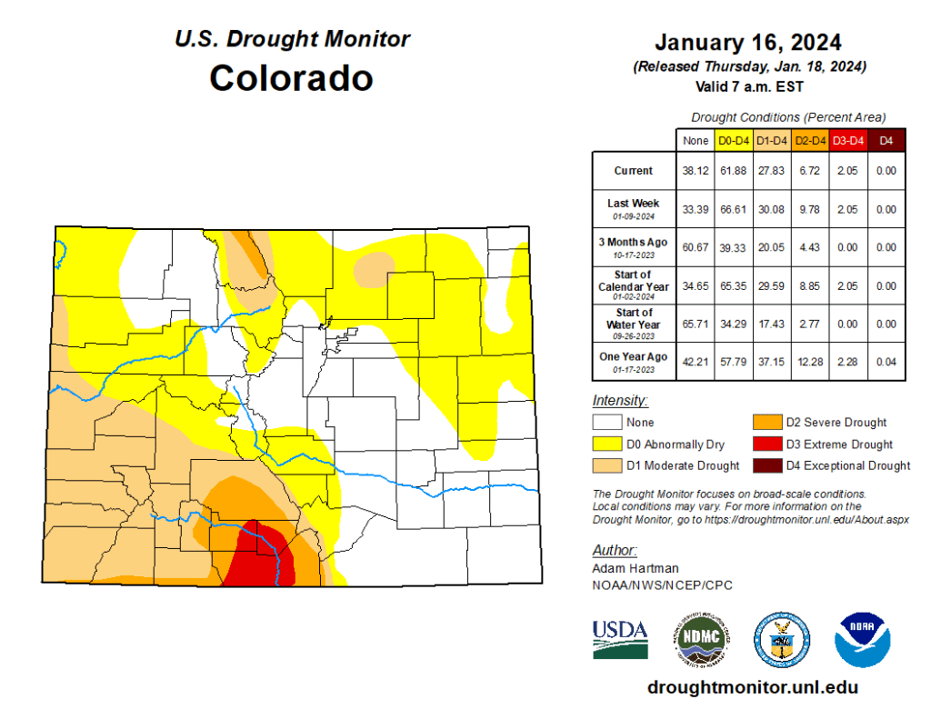 Storminess in recent weeks and frigid temperatures this week warrant no changes across much of the Central and Northern Plains. However, there are mixed improvements (Colorado Plateau) and degradations (High Plains along the Front Range) warranted this week. Improvements to snowpack and short-term precipitation deficits this week warrant the improvements across the Colorado Plateau. Conversely, the lack of seasonal snow cover has led to degradations across parts of the High Plains along the Front Range, due to topsoils being exposed and drying out…
