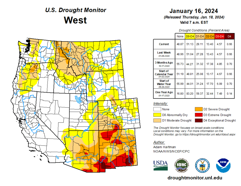 It was another stormy week across much of the eastern lower 48 states leading to widespread drought improvements from the Mississippi River Valley eastward to the Appalachians. A powerful storm system early in the week (January 9-10) brought heavy rainfall to parts of the eastern U.S., with most locations from Georgia to New England picking up more than 2 inches of precipitation, leading to flooding for several locations. In some locations across the Mid-Atlantic and interior Northeast, flooding was exacerbated by melting snow left over from a winter storm hitting the region the previous weekend (January 6-7). Behind the powerful storm system early this week, cold air plunged southward from Canada across the northern tier states, gradually spreading southward and eastward and overtaking most of the country east of the Rockies by the end of the week (January 16). Toward the end of the week, another storm system dropped wintry precipitation in a swath stretching from the Ozarks eastward to the Mid-Atlantic and Northeast. Across the western lower 48 states, precipitation was above average for the week, leading to targeted improvements to drought areas across the Intermountain West, where snowpack continues to build for several locations. Unfortunately, weekly precipitation and seasonal snowpack remain below normal this week across the Southwest and northern Rockies, leading to some degradation of drought conditions. No changes are warranted in Alaska this week, as the snowpack is in good shape statewide. Hawaii received more heavy rainfall this week, predominantly from a Kona Low early on, leading to improvement. Conversely, another warm and dry week in Puerto Rico warranted another round of degradation…