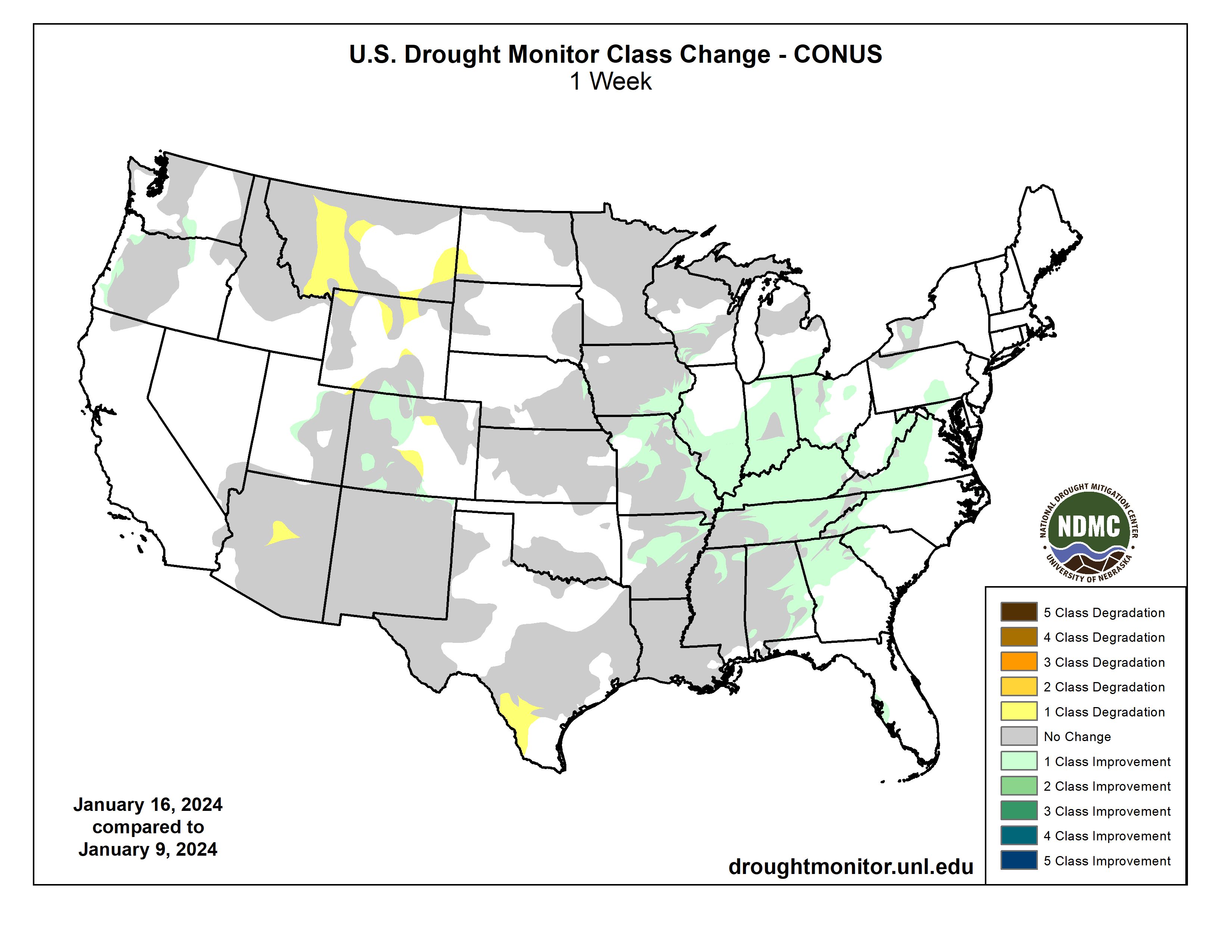 It was another stormy week across much of the eastern lower 48 states leading to widespread drought improvements from the Mississippi River Valley eastward to the Appalachians. A powerful storm system early in the week (January 9-10) brought heavy rainfall to parts of the eastern U.S., with most locations from Georgia to New England picking up more than 2 inches of precipitation, leading to flooding for several locations. In some locations across the Mid-Atlantic and interior Northeast, flooding was exacerbated by melting snow left over from a winter storm hitting the region the previous weekend (January 6-7). Behind the powerful storm system early this week, cold air plunged southward from Canada across the northern tier states, gradually spreading southward and eastward and overtaking most of the country east of the Rockies by the end of the week (January 16). Toward the end of the week, another storm system dropped wintry precipitation in a swath stretching from the Ozarks eastward to the Mid-Atlantic and Northeast. Across the western lower 48 states, precipitation was above average for the week, leading to targeted improvements to drought areas across the Intermountain West, where snowpack continues to build for several locations. Unfortunately, weekly precipitation and seasonal snowpack remain below normal this week across the Southwest and northern Rockies, leading to some degradation of drought conditions. No changes are warranted in Alaska this week, as the snowpack is in good shape statewide. Hawaii received more heavy rainfall this week, predominantly from a Kona Low early on, leading to improvement. Conversely, another warm and dry week in Puerto Rico warranted another round of degradation…